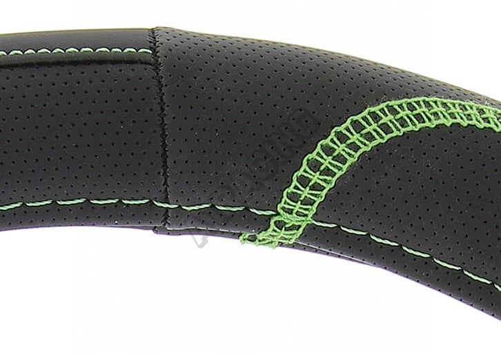 Kvalitní potah na volant se zeleným prošitím. Po celém obvodu má děrování, které snižuje nesklouznutí rukou z věnce volantu. Určeno pro průměry volantů 37-39 cm.