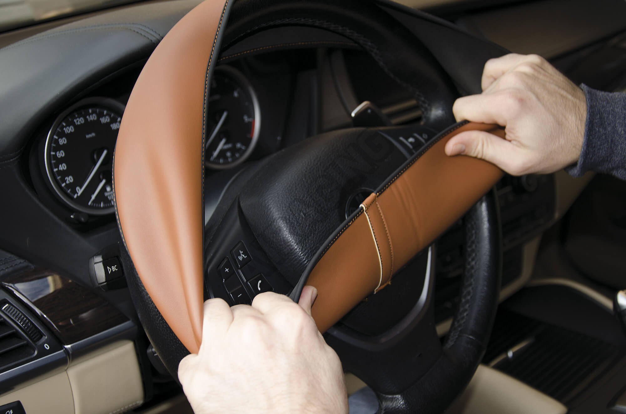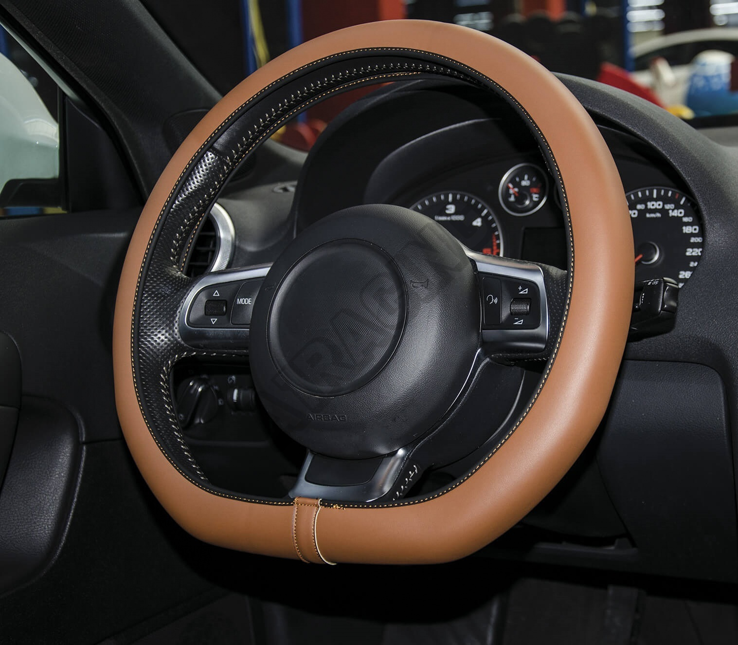 Tento potah volantu věrně imituje hnědou přírodní kůži. Kraj je efektně v černé barvě s prošitím. Určeno pro průměr volantu 37-38 cm.