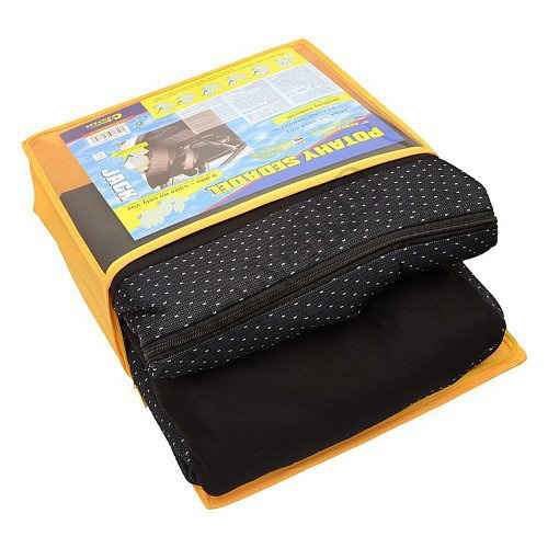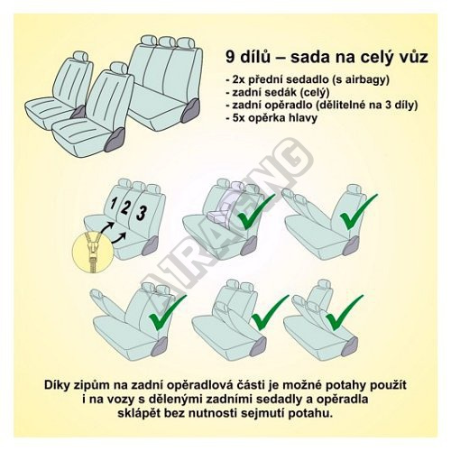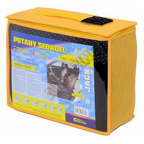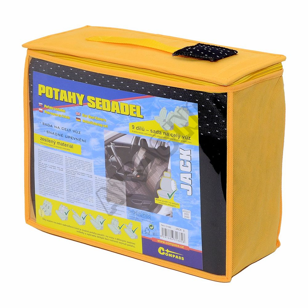 Potahy sedadel "JACK", sada na celý vůz. Potah je vyroben ze zpevněného podšitého materiálu v celé ploše, lze připevnit na většinu běžně používaných automobilových sedadel. Potah lze použít na sedadlech, která mají zabudovaný boční airbag přímo v opěradle předních sedadel. Balení obsahuje potah na přední sedadlo (2x), zadní sedák (celý), zadní opěradlo (pomocí zipu dělitelné na 3 díly), opěrku hlavy (5x). Díky zipům na zadní opěradlová části je možné potahy použít i na vozy s dělenými zadními sedadly a opěradla sklápět bez nutnosti sejmutí potahu.
