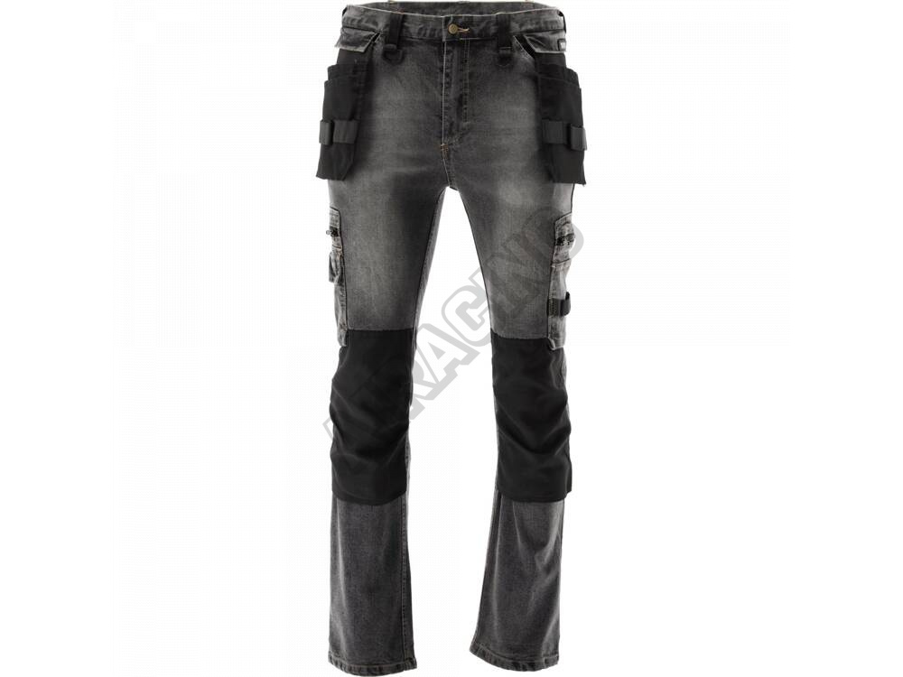 Montážní pracovní kalhoty s elastanem, vyrobené z obnošené a strečové džínoviny. Až sedmnáct kapes, včetně jedné se zapínáním na suchý zip, dvou se zapínáním na zip a dvou odnímatelných kapes pro montéra. Velké množství základních kapes a montážních kapes z odolného materiálu pomůže zorganizovat práci tesaře, pokrývače nebo klempíře.
