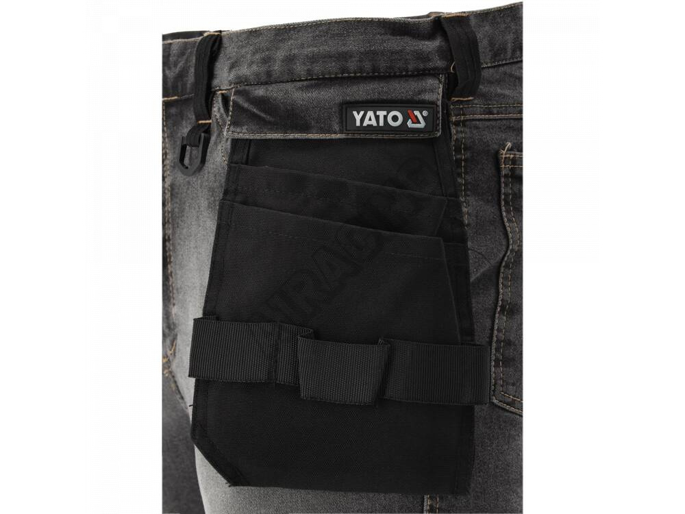 Na levé nohavici je velká kapsa na zip, čtyři úzké kapsy a čtyři poutka na nářadí a na pravé nohavici je velká kapsa na zip, dvě menší včetně jedné se zapínáním na suchý zip a úzká kapsa např. na dřevěné pravítko. Dvě velké kapsy vzadu pod pasem, kapsy na kolenou z tkaniny odolné proti oděru pro chrániče kolen, např. TO-74595.