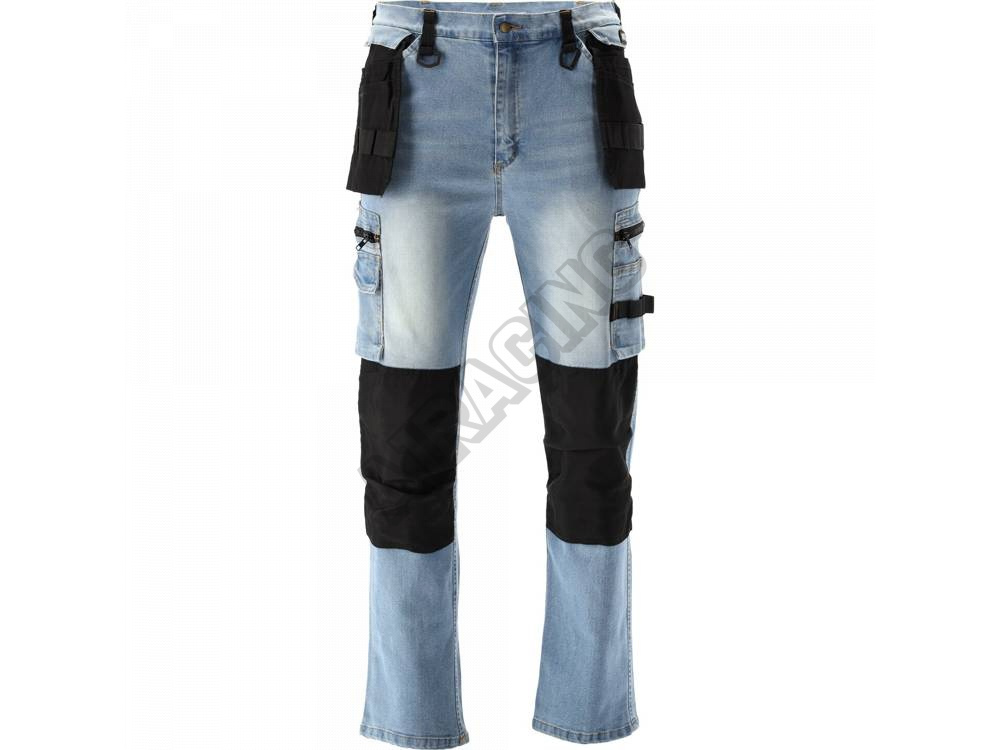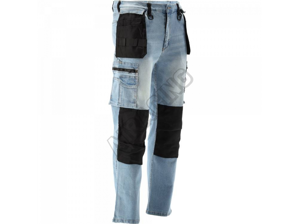 Montážní pracovní kalhoty s elastanem, vyrobené z obnošené a strečové džínoviny. Až sedmnáct kapes, včetně jedné se zapínáním na suchý zip, dvou se zapínáním na zip a dvou odnímatelných kapes pro montéra. Velké množství základních kapes a montážních kapes z odolného materiálu pomůže zorganizovat práci tesaře, pokrývače nebo klempíře.