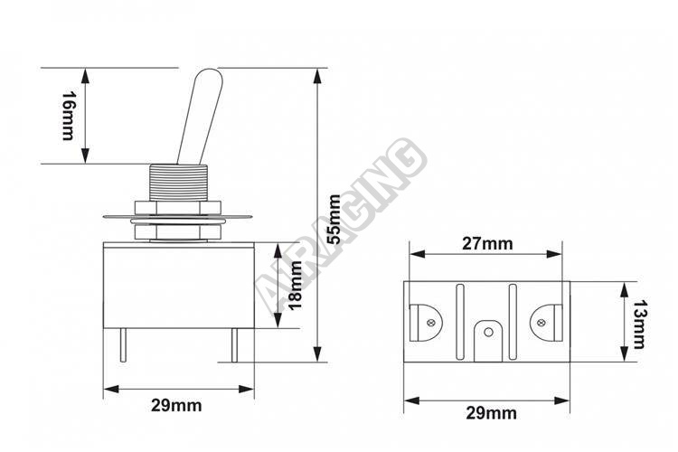 Univerzální jednopolohový přepínač typu Toggle. Vyrobeno z kovu. Napětí 12V, proud 20A.