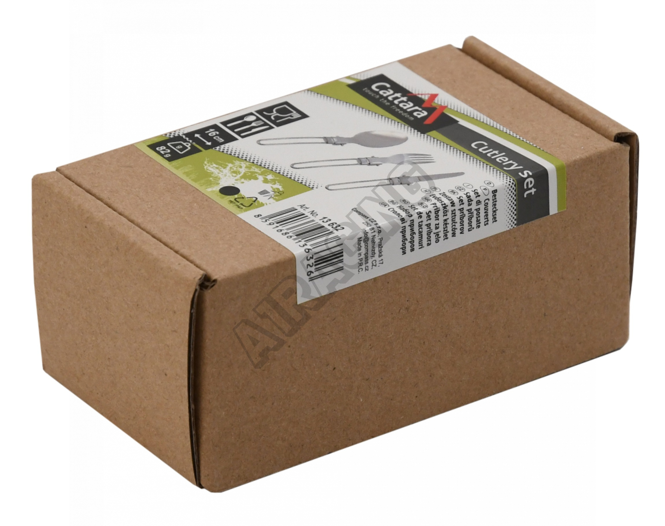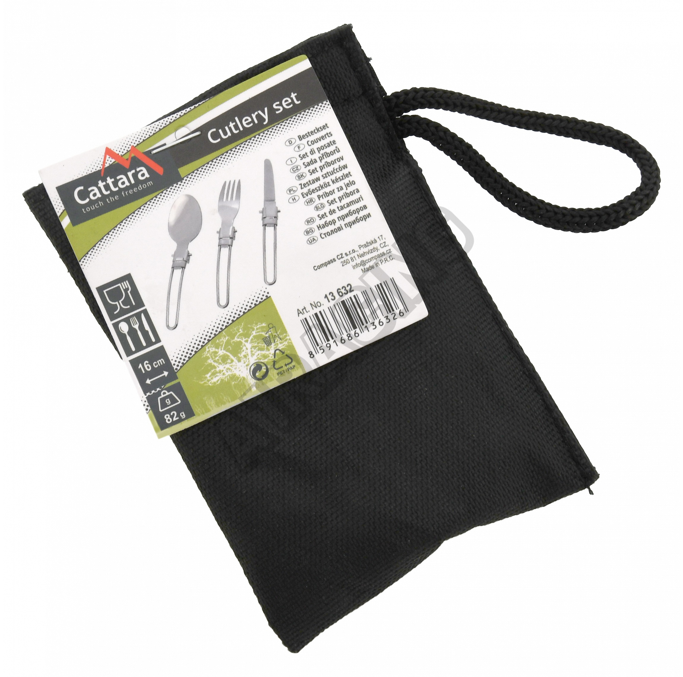 Sada se skládá ze lžíce, nože a vidličky délky 16 cm s celkovou hmotností 80g, uložených v textilním pouzdře s rozměry 8 x 12 x 3 cm.