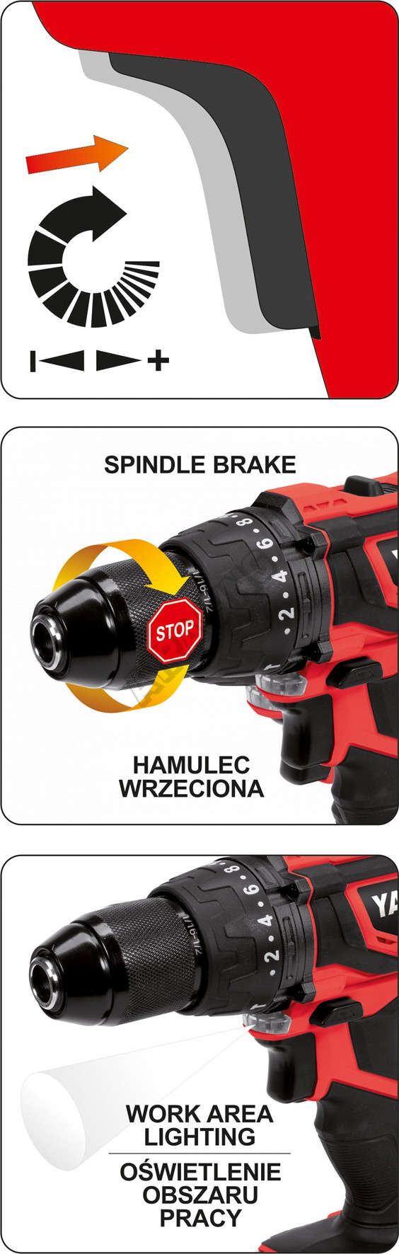 Do sklíčidla je možné upnout nástroje do průměru 13 mm. Vrtačka je dále vybavena i LED přisvětlením pro práci ve špatně dostupných místech.