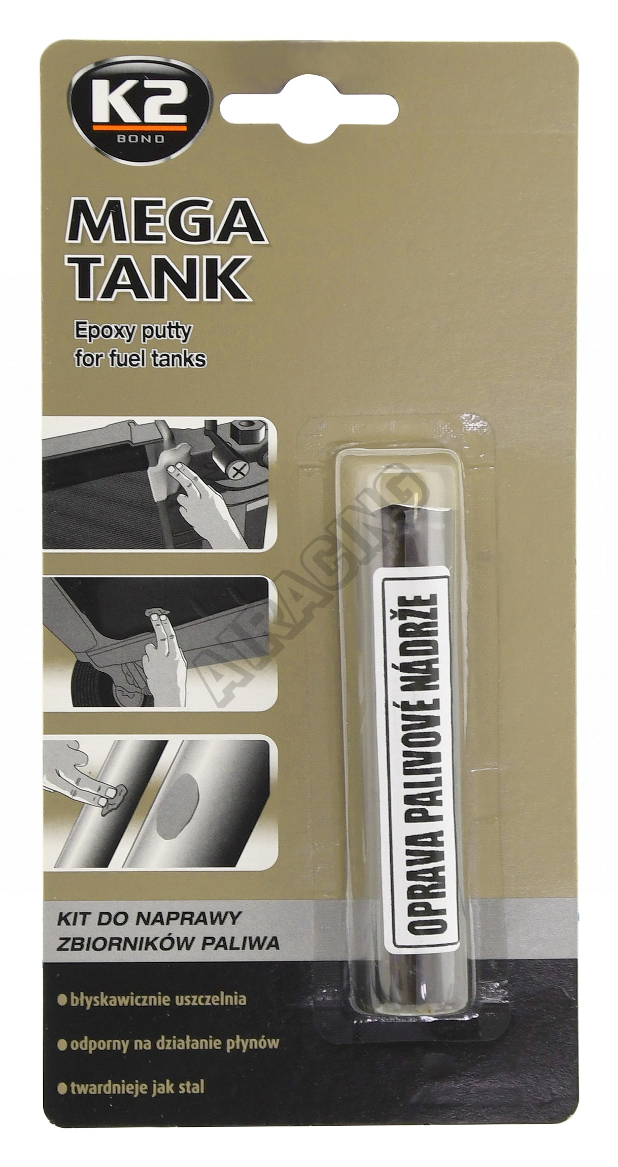 GAS TANK REPAIR 28 G určený pro opravu palivových nádrží a chladičů. Dokonalý prostředek k rychlé opravě palivových nádrží a chladičů bez nutnosti demontáží a letování. Zaplňuje malé dírky a prasklinky a spáry. Tento speciální preparát působí i za přítomnosti benzínu nebo vody. Zastavuje protékání v rourových spojích, na lodích, v chladicčích, bazénech, vodních nádržích, poklopech převodovek. Opravuje zdi, beton. Je to jednoduchý kyt s tvrdostí oceli.