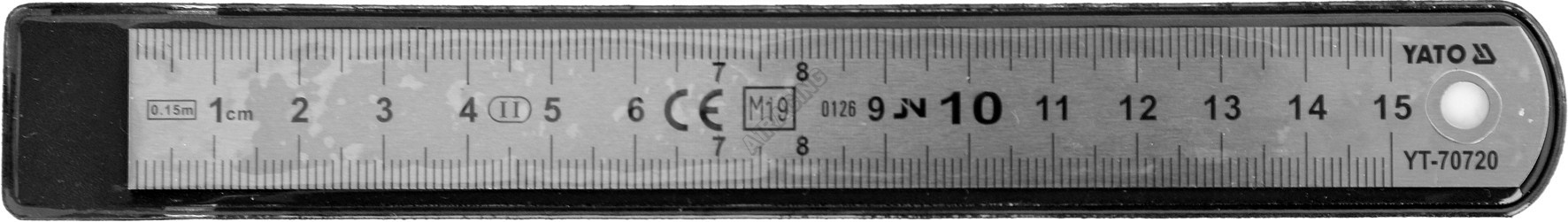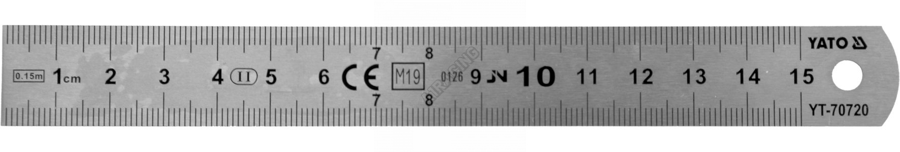 Pružné pravítko s přesností třídy II. Vyrobeno z nerezové oceli. Na obou okrajích je milimetrová stu