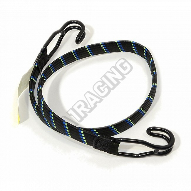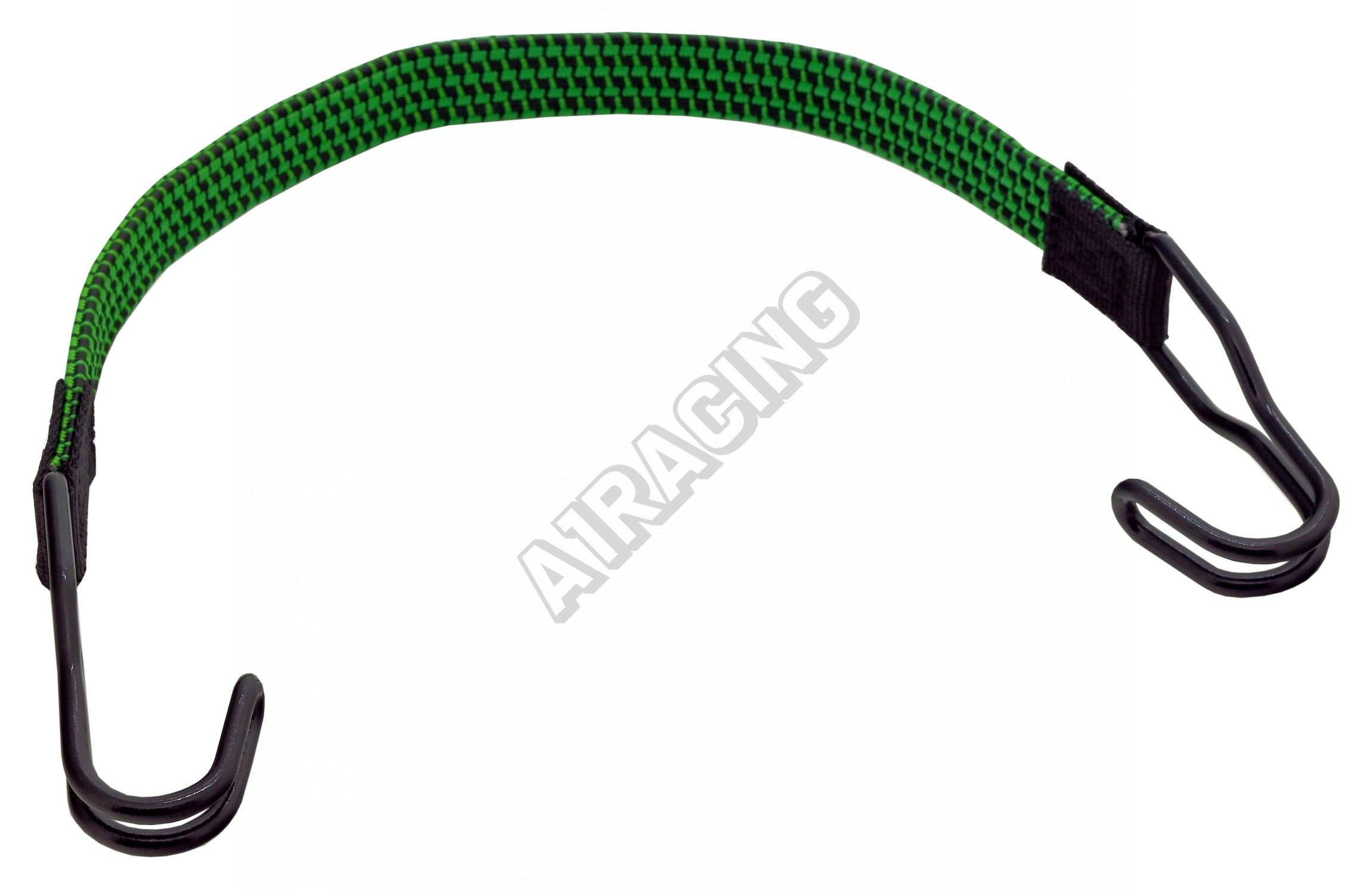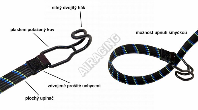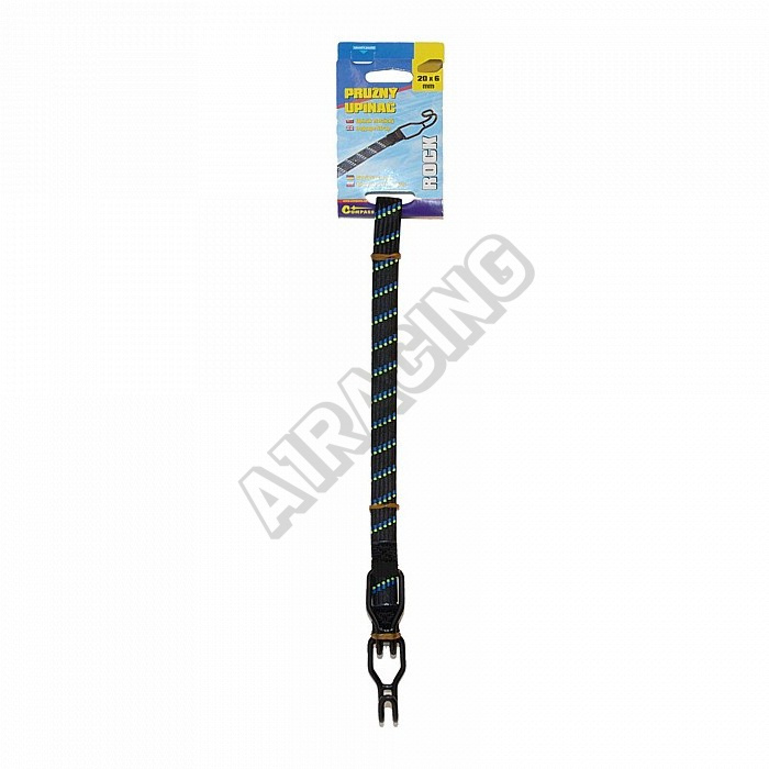 Pružný upínač plochého průřezu zakončený dvěma kovovými háky. Tyto háky díky své konstrukci umožňuj