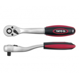 Ráčna vyhnutá s plastovou rukojetí 3/8"( 9,5mm) s přepínací páčkou, délka 05mm, ráčnový mechanismus s 72 zubu, vyroben z kvalitní chromvanadiové slitiny oceli CrV6140 splňující normou DIN3122.