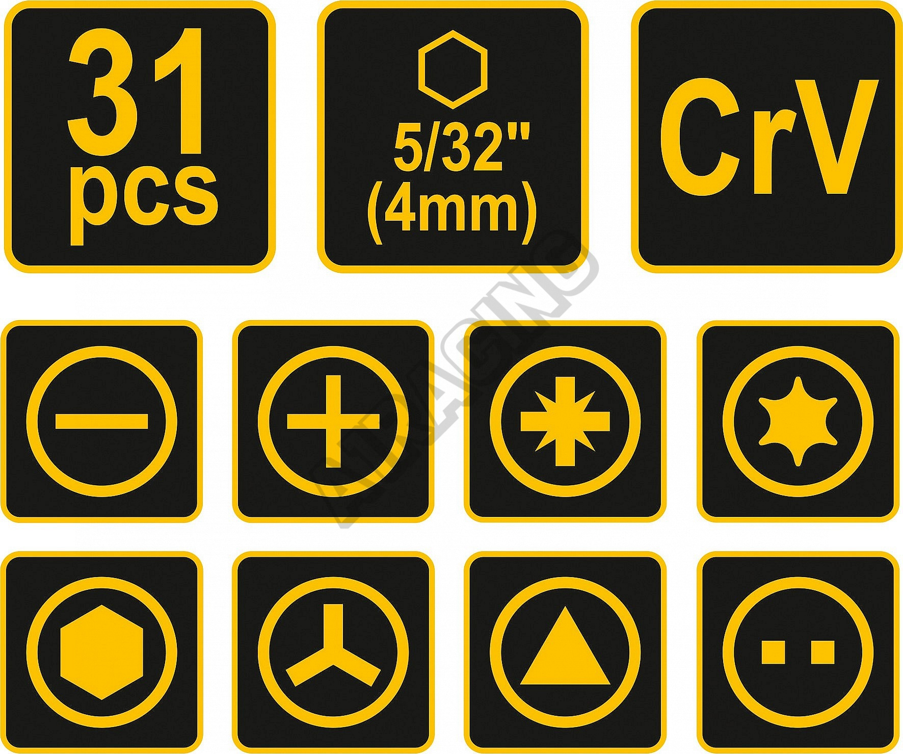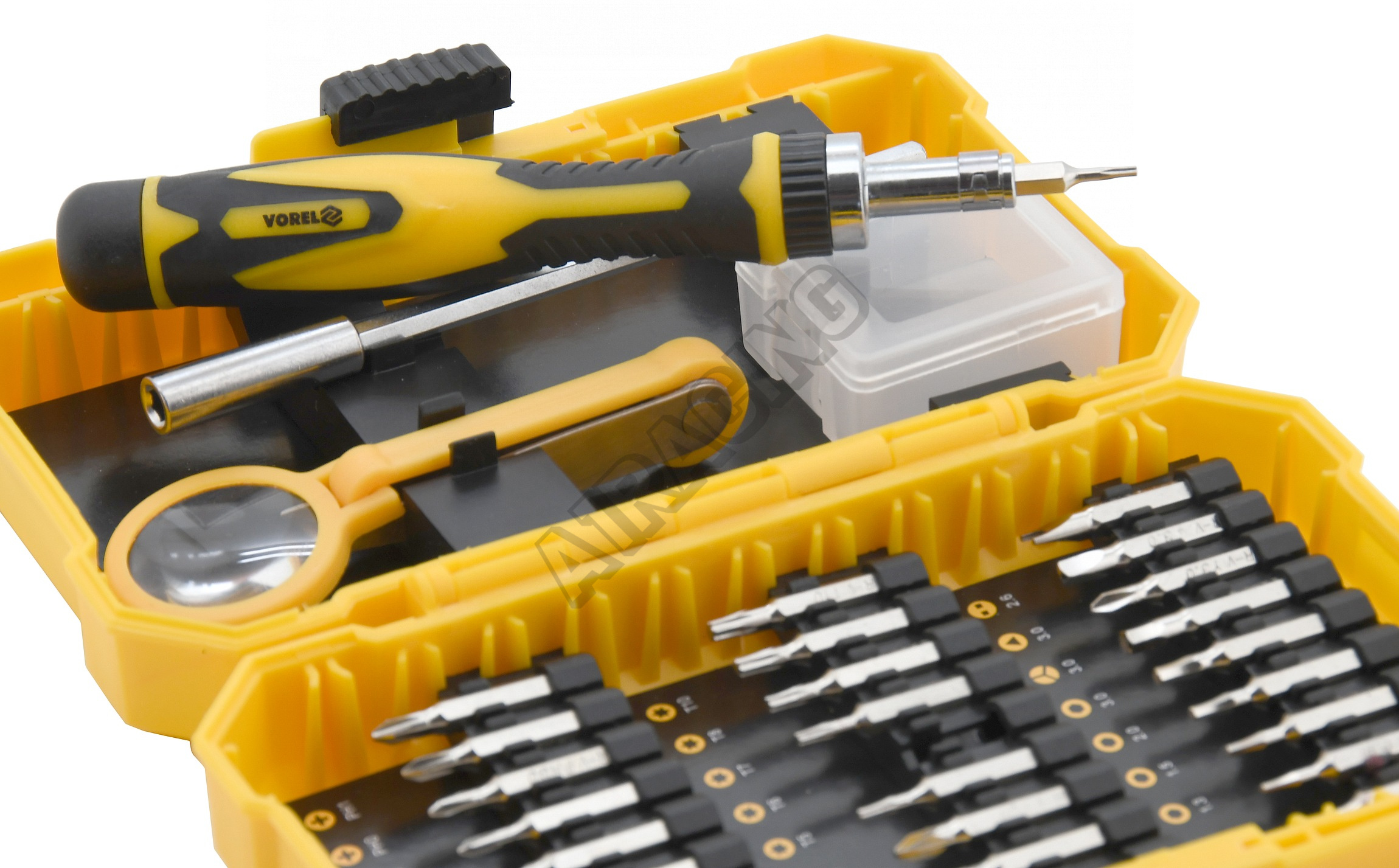 Nářadí je precizně zpracováno z CrV oceli a jednotlivé nástavce 5/32"(4 mm) jsou magnetické, čímž usnadňují práci se součástkami. Šroubovák s ráčnovým mechanismem je opatřen pojistkou, bránící vypadnutí nástroje. V sadě se dále nachází krabička pro ukládání drobných součástek a nástroj složený z držáku a lupy, pro lehké a rychlé zkoumání drobných součástí a jejich případných vad.