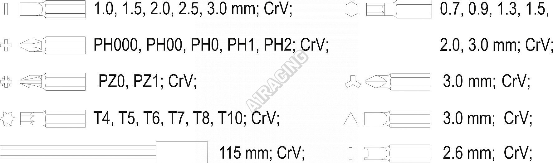 - bit Torx T4; T5; T6; T7; T8; T9; T10