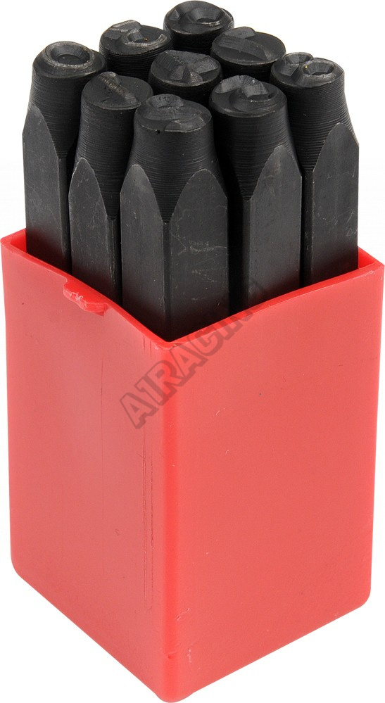 Sada raznic s numerickými znaky 0-9 o velikosti 6mm. Pro číslici 9 se používá otočený razník 6. Jed