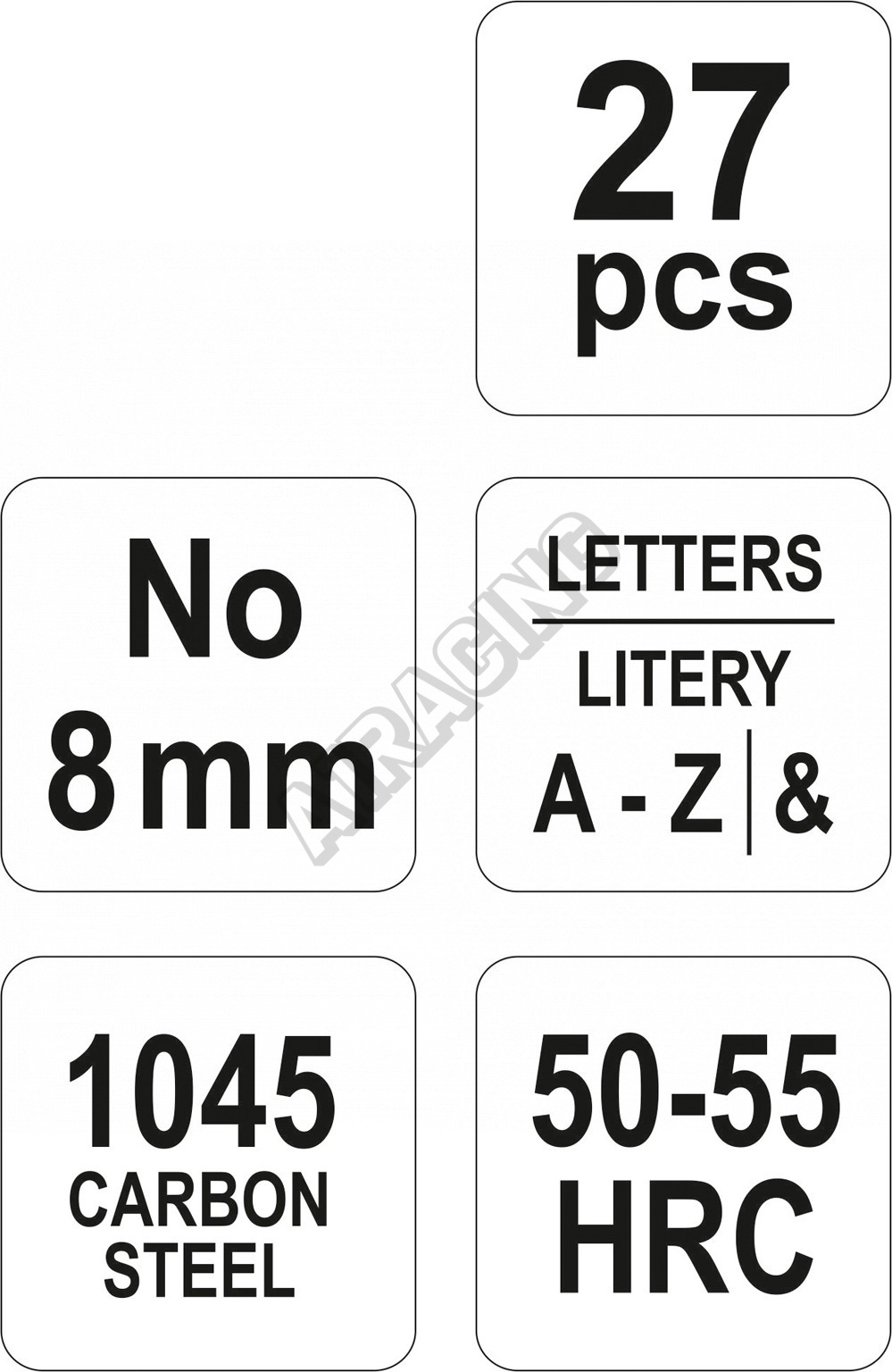 Sada raznic s písmenky 27ks o velikosti 8mm. Sada obsahuje razníky velká písmenka A-Z a znak &.