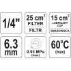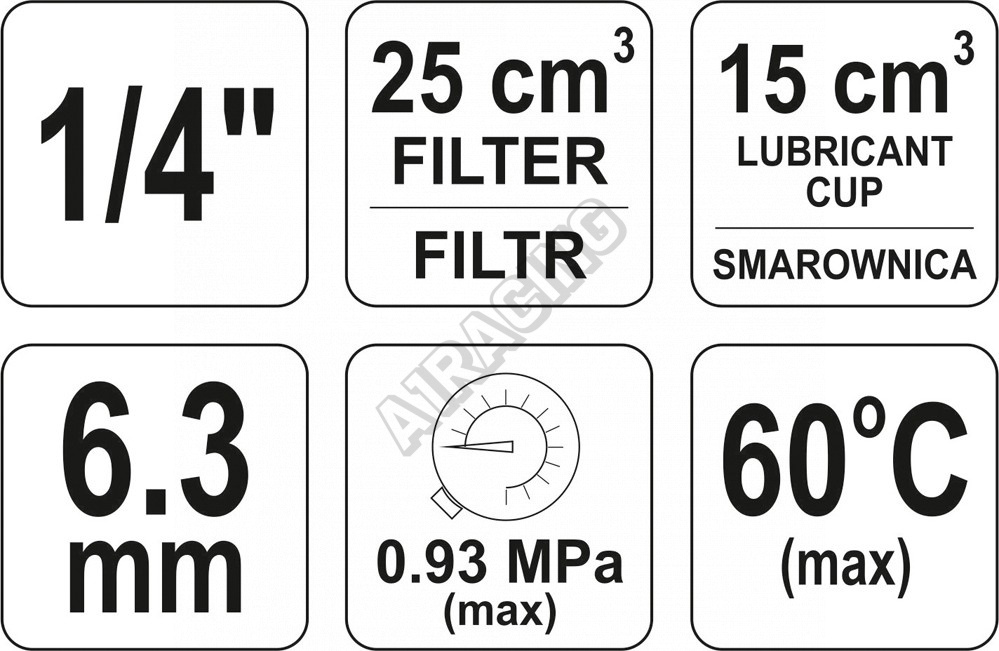 • pracovní tlak 0 - 9,3 bar • vstup - vnitřní závit G 1/4" • výstup - vnitřní závit G 1/4" • objem filtru vlhkosti 25 cm3 • objem nádobky přimazávání 15 cm3 • provozní teplota max. 60° C • stupnice manometru v jednotkách bar / psi