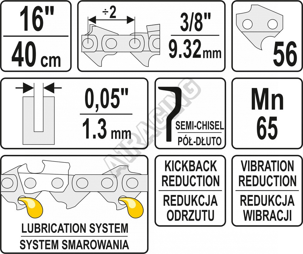 Délka 16", celkem 56 článků s roztečí 3/8" a šířkou 0,05" (1,3 mm).