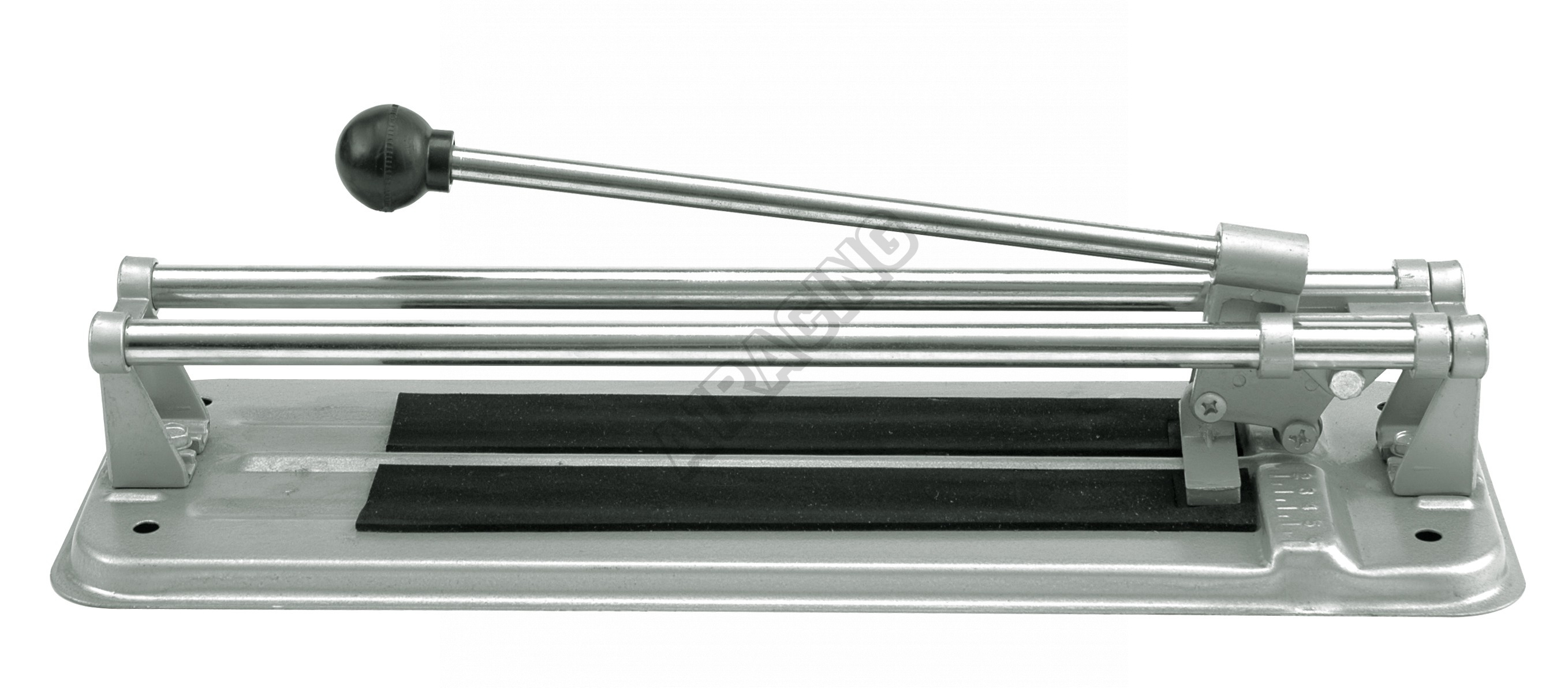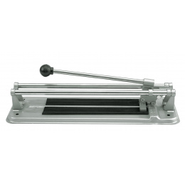 Řezačka na keramické obklady a dlažby s ložiskovým vedením nože, s plechovým podstavcem.