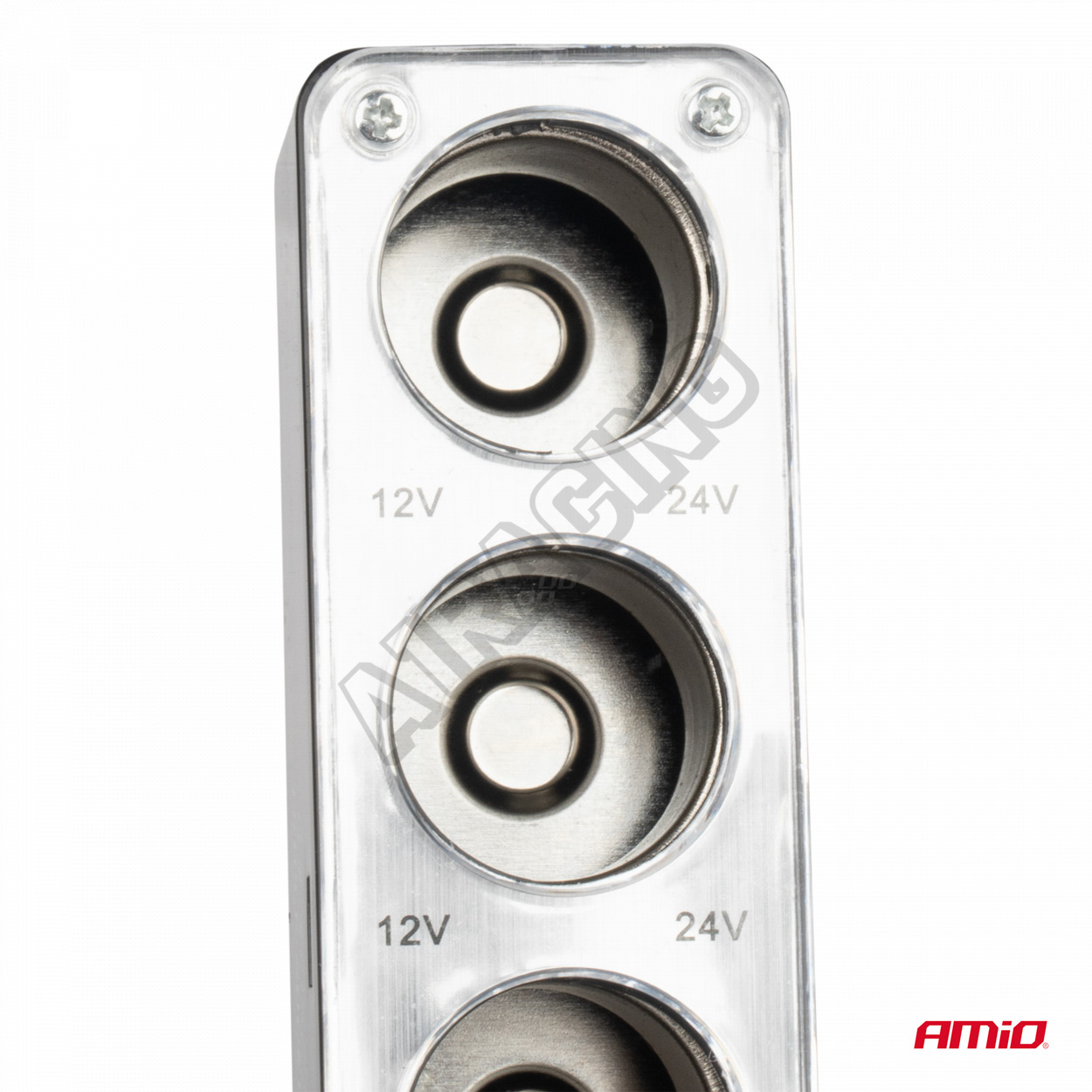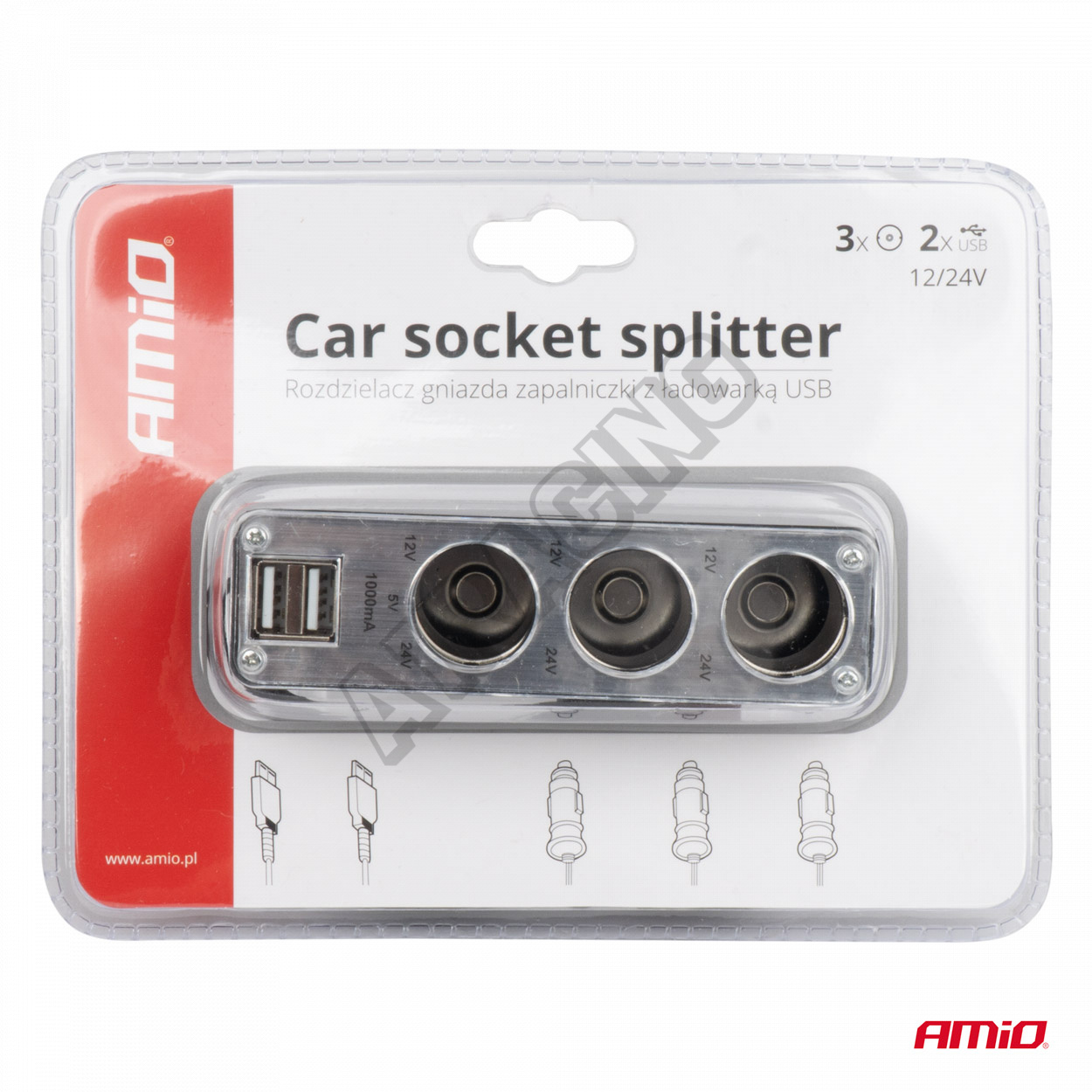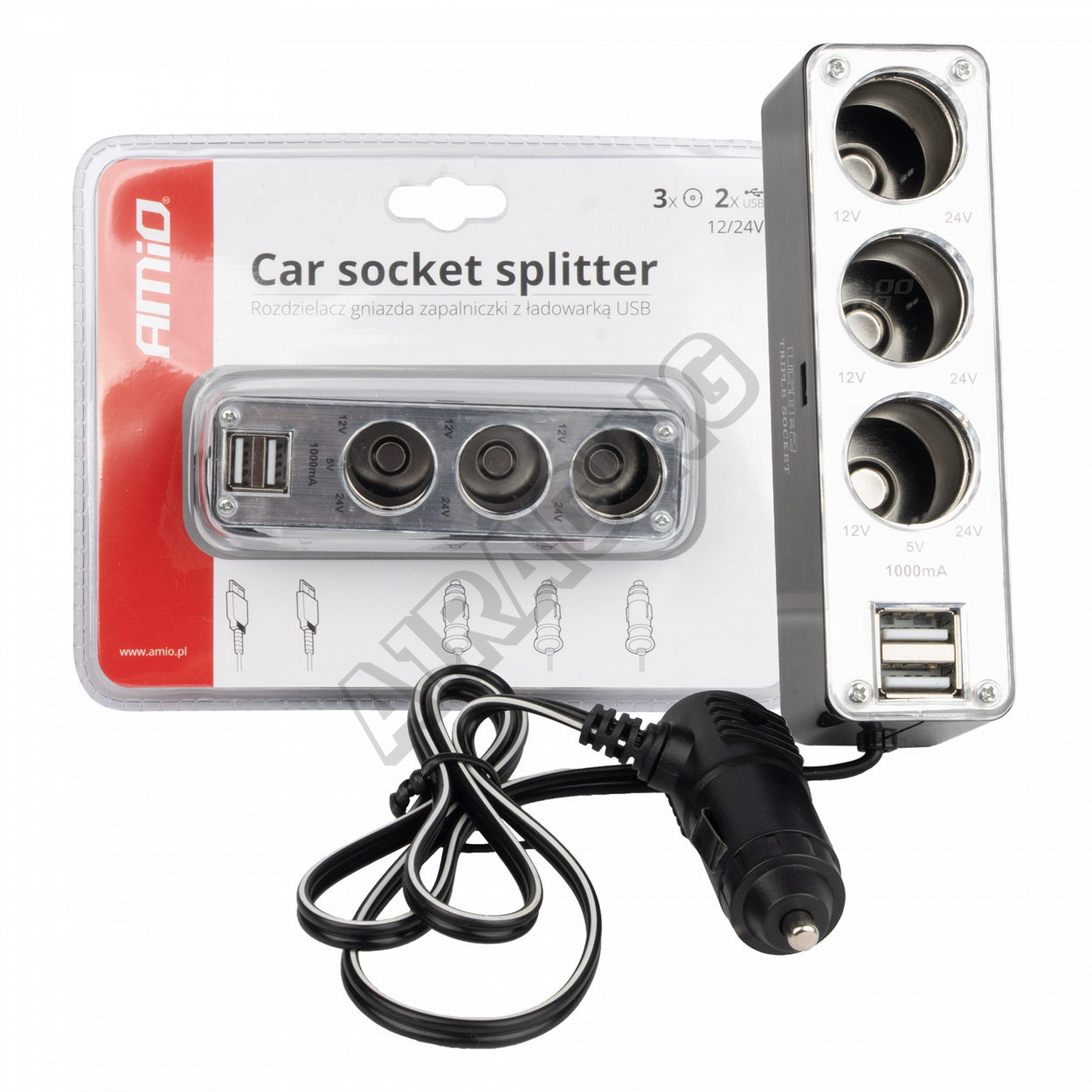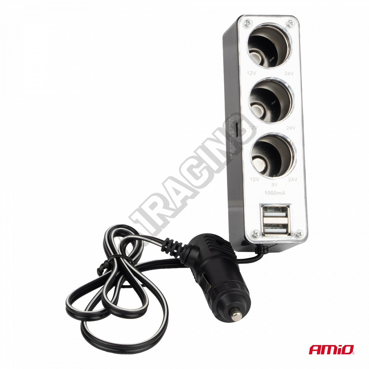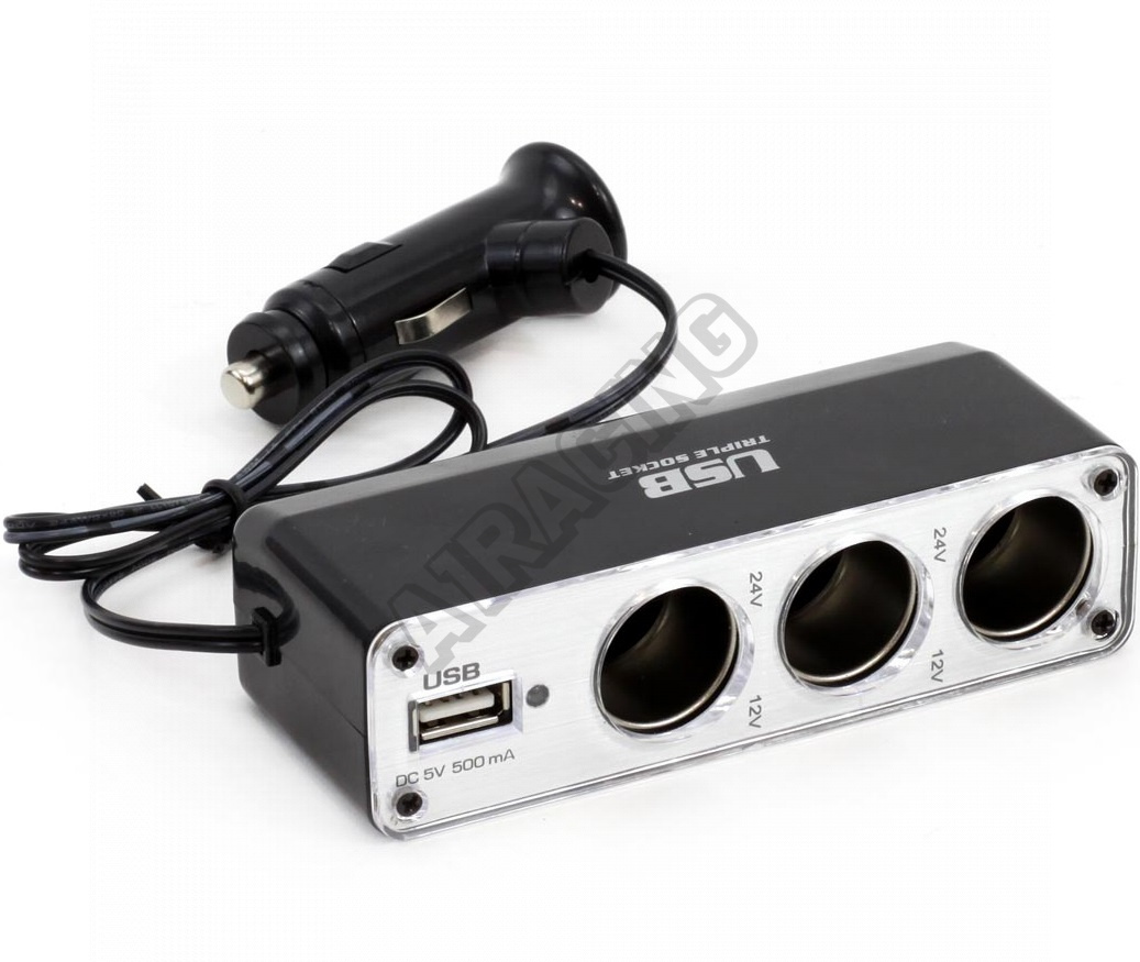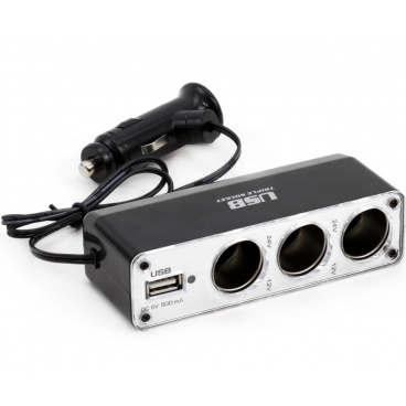 Roztrojka s USB: Připojení až 3. zařízení do zdířky cigaretového zapalovače automobilu.Určeno pro 12V a 24 V. Možnost nabíjení 1. USB zařízení přes USB zásuvku./ např. IPOD, MP3 přehrávač atd/