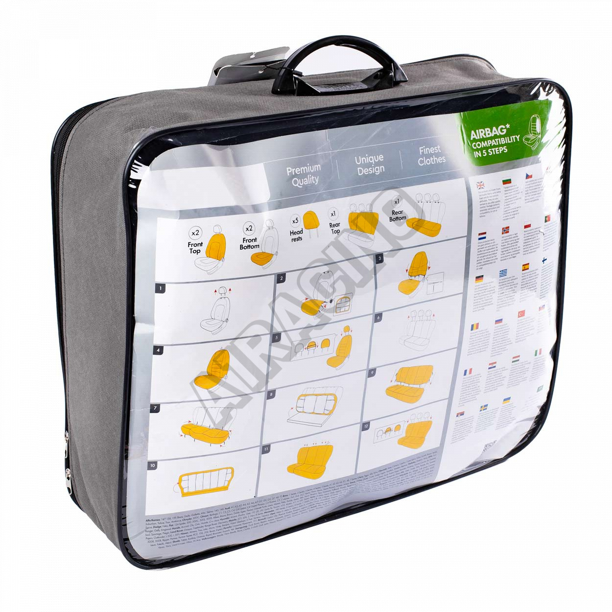Potahy mají zipy na zadní lavici, díky čemuž pasují na většinu sedadel dostupných na trhu, (lavic nedělených, dělených pravostranně i levostranně).