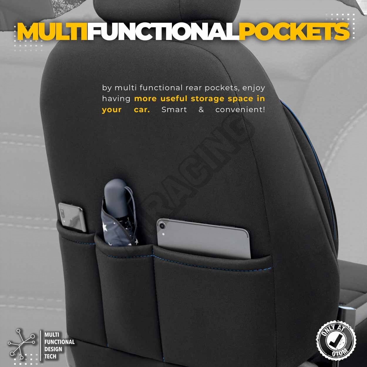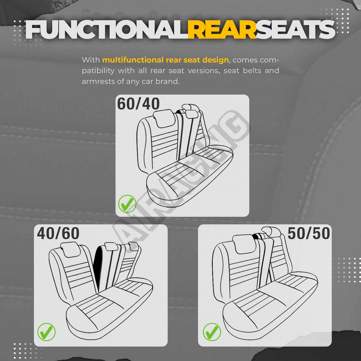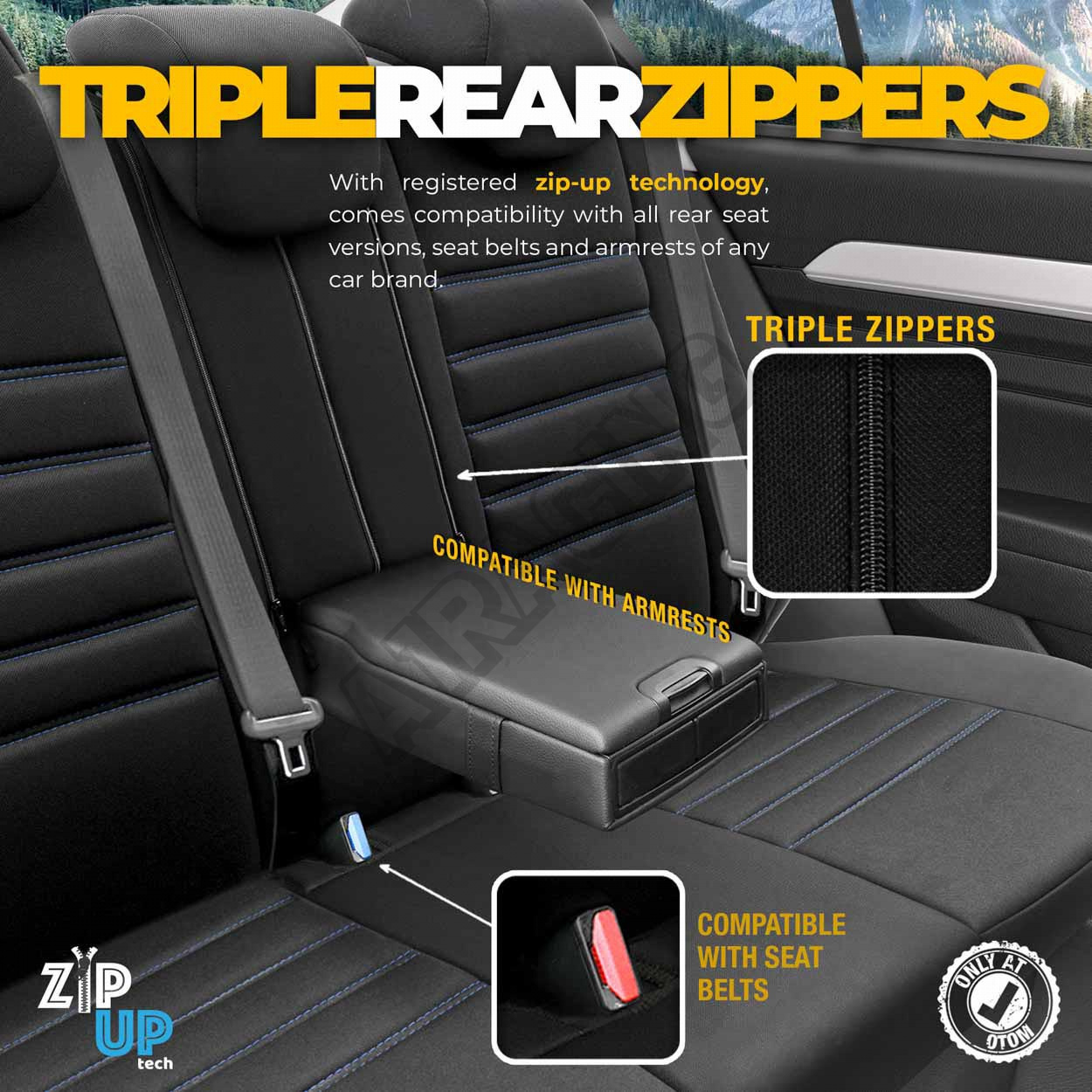 Potahy mají zipy na zadní lavici, díky čemuž pasují na většinu sedadel dostupných na trhu, (lavic nedělených, dělených pravostranně i levostranně).