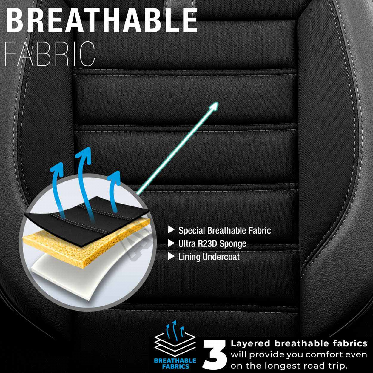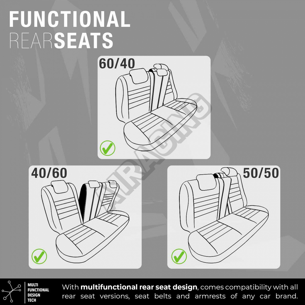 Potahy mají zipy na zadní lavici, díky čemuž pasují na většinu sedadel dostupných na trhu, (lavic nedělených, dělených pravostranně i levostranně).