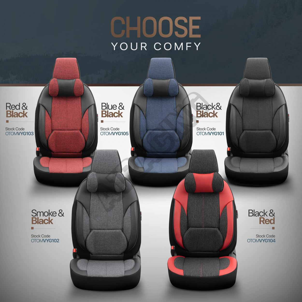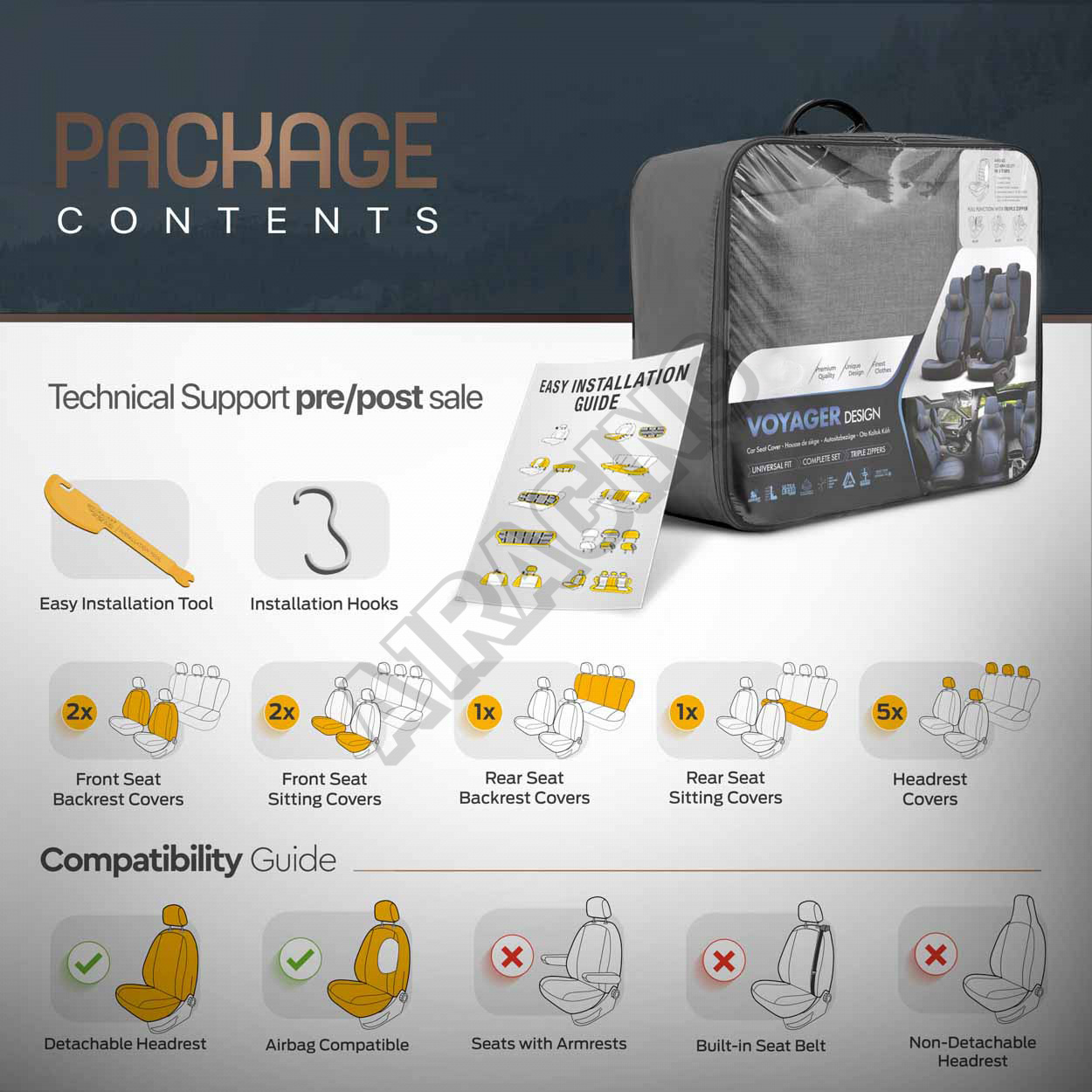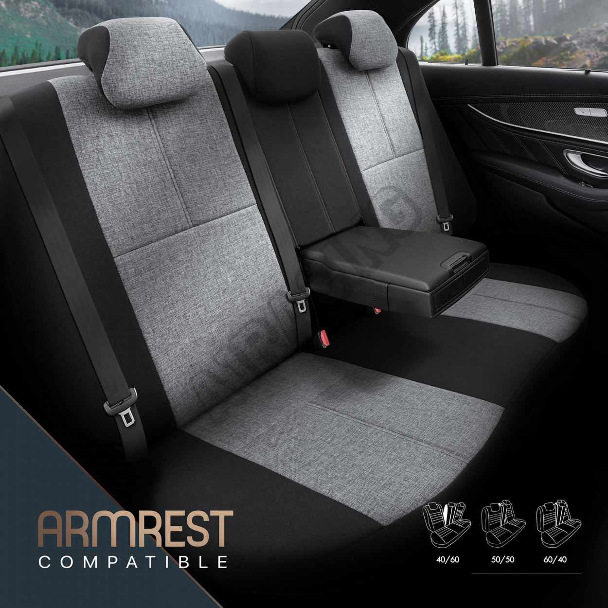 Potahy mají zipy na zadní lavici, díky čemuž pasují na většinu sedadel dostupných na trhu, (lavic nedělených, dělených pravostranně i levostranně).
