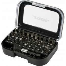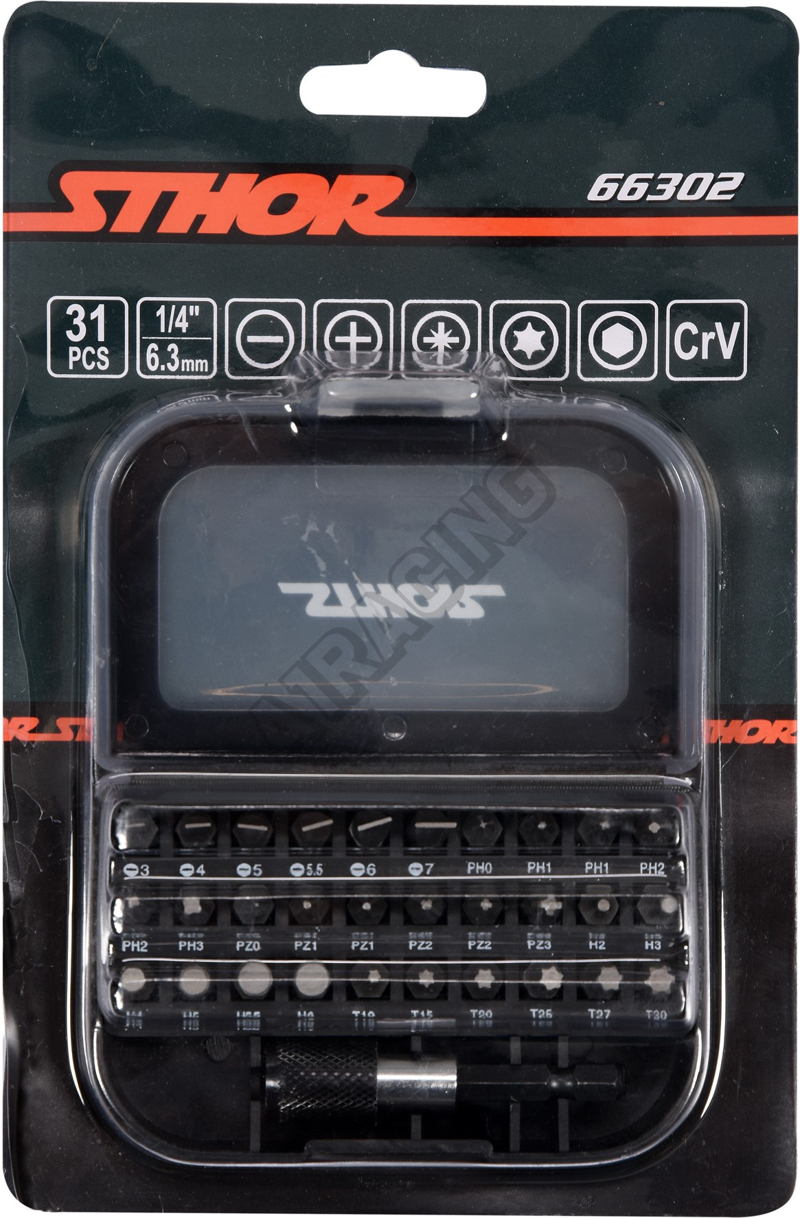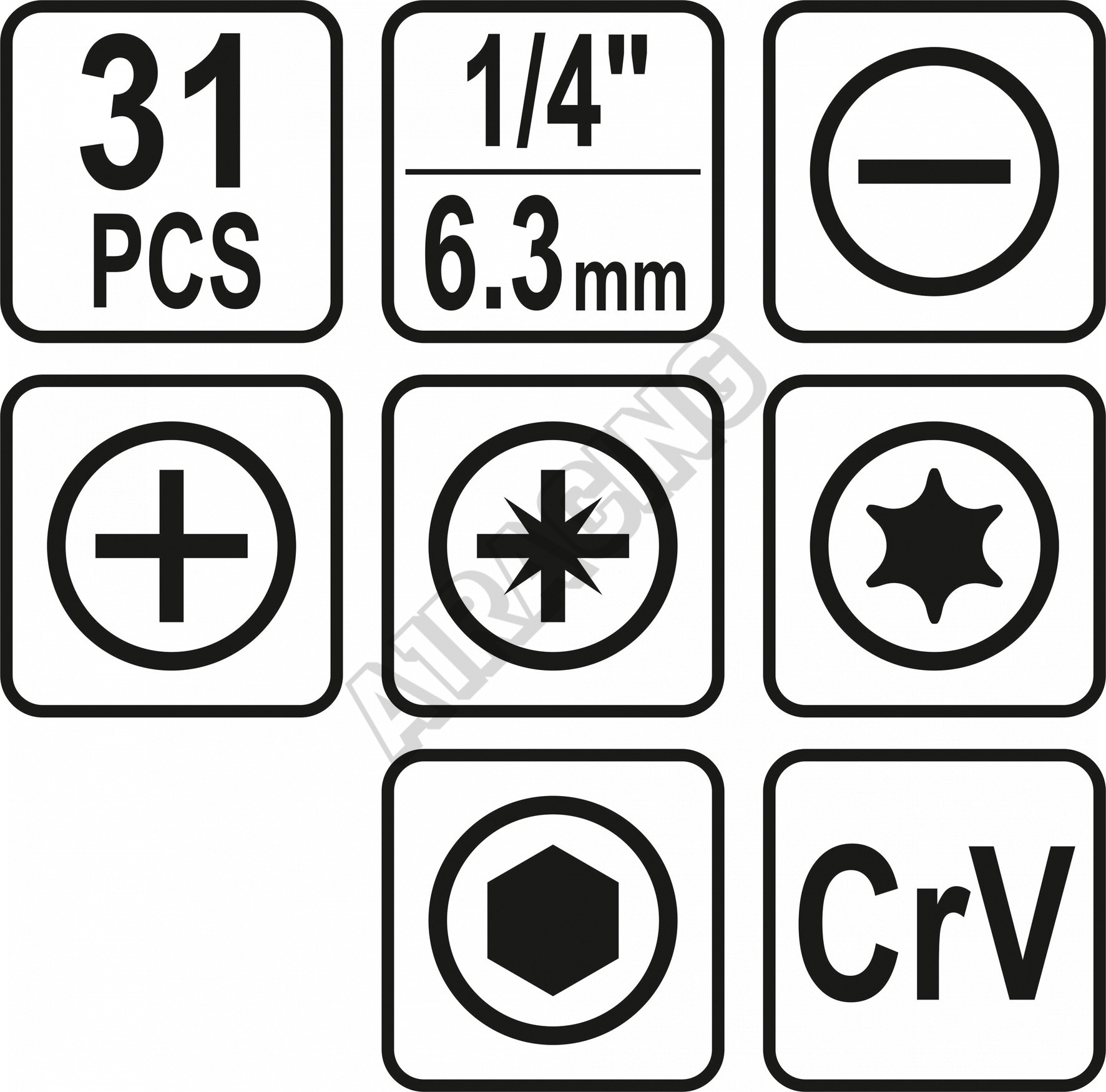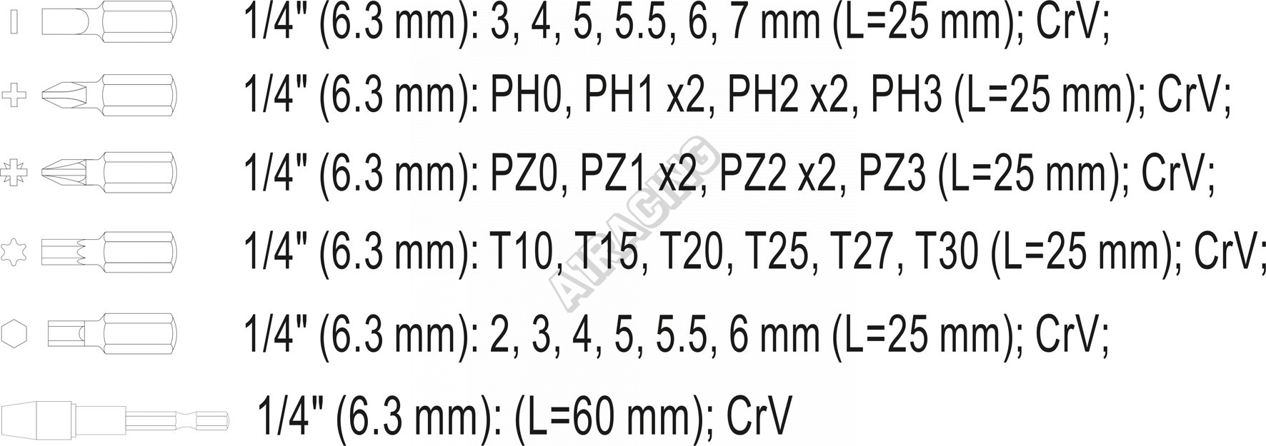 Jednotlivé bity jsou vyrobené z kvalitní CRV oceli. Sada je uložena v přehledném plastovém pouzdře.