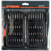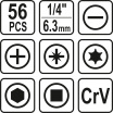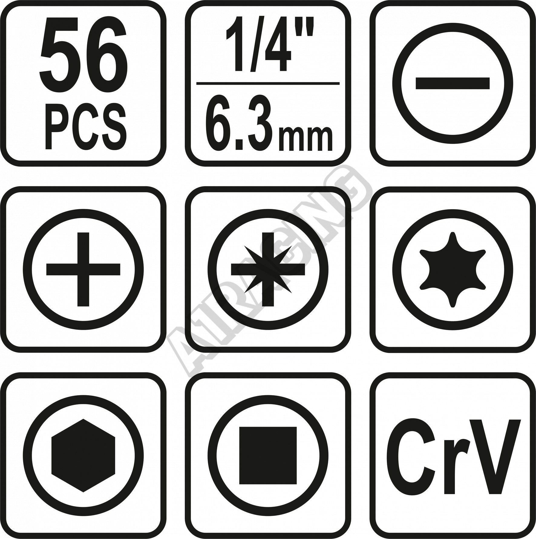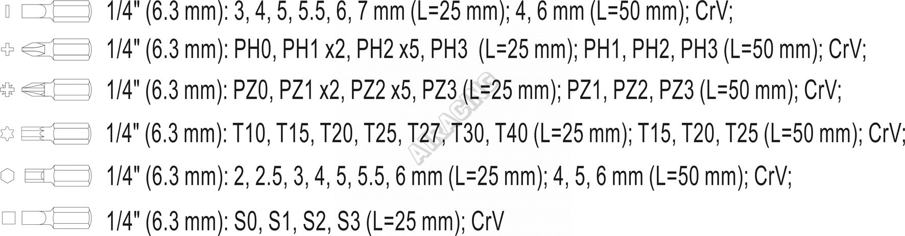 Jednotlivé bity délek 25 a 50 mm jsou vyrobené z kvalitní CRV oceli. Sada je uložena v přehledném plastovém pouzdře.