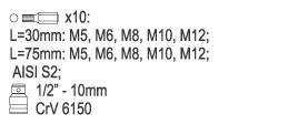 Tato sada je vhodná pro profesionály, především pro mechaniky. Bity jsou spolu s adaptérem uzpůsobeny pro práci s ráčnou 1/2". V sadě se nachází bity vícezubé M5, M6, M8, M10, M12 dvou délek (30 a 75 mm) a ty jsou vzhledně a prakticky uspořádány kovovém kufříku.