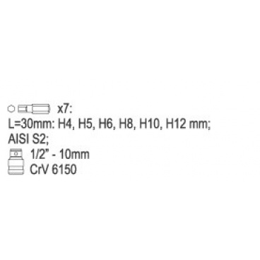 Tato sada je vhodná pro profesionály, především pro mechaniky. Bity jsou spolu s adaptérem uzpůsobeny pro práci s ráčnou 1/2". V sadě se nachází bity imbus H4, H5, H6, H8, H10 a H12.