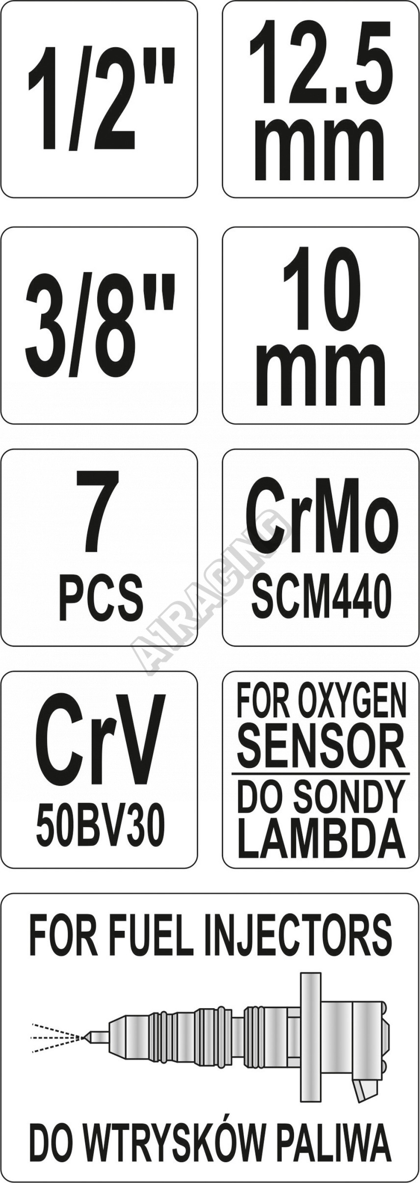 Sada se skládá ze 7 ks precizních klíčů, zhotovených z Cr-Mo slitiny oceli SCM-440 se zakončení 1/2" a 3/8".