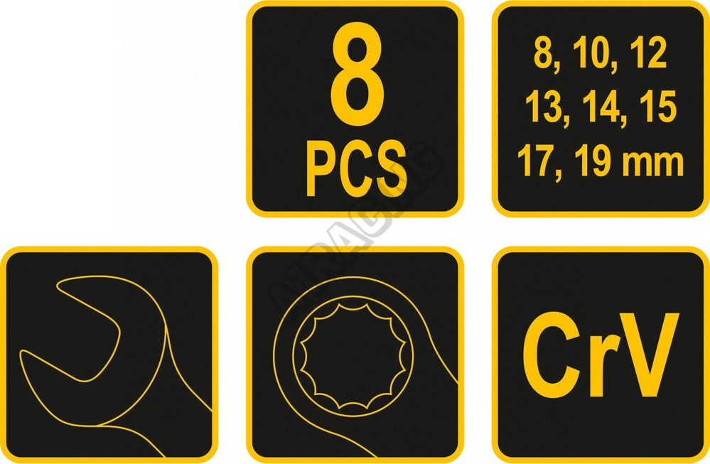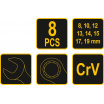 Sada klíčů očkoplochých 8 ks 8 - 19 mm vyrobené z kvalitní CrV oceli, uložené v přehledném odolném pouzdře ze silné syntetické tkaniny.