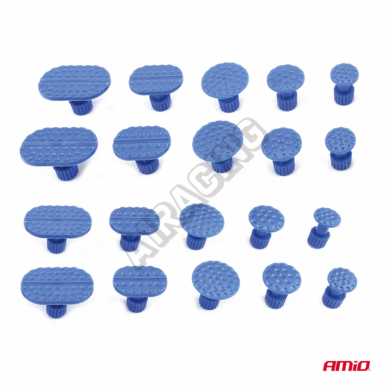 Sada obsahuje 20 vyměnitelných houbiček o různých průměrech, což poskytuje plnou flexibilitu při práci s různými druhy promáčklin – od malých bodových po větší plošné. Ergonomický nástroj a pevná konstrukce zaručují komfort práce a opakovatelné výsledky, jak v profesionální dílně, tak při domácí opravě auta.