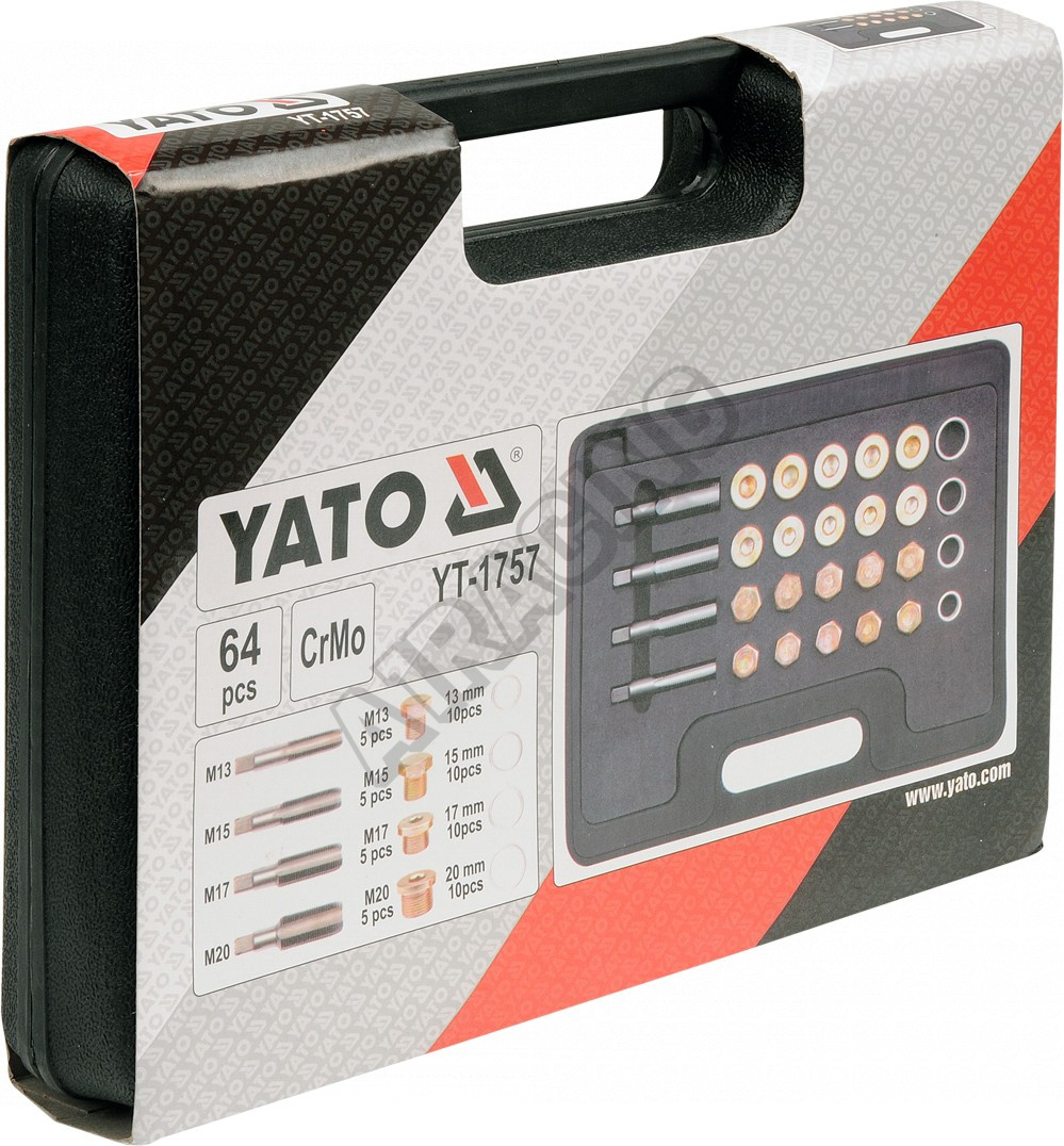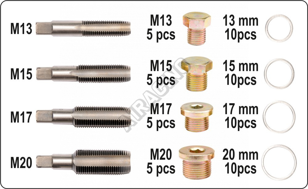 Sada obsahuje opravu pro čtyři typy závitu: M13, M15, M17, M20 a to jednostupňové závitníky z CrMo oceli, 5 ks šroubů a 10 podložek odpovídajících rozměrům pro daný závit.