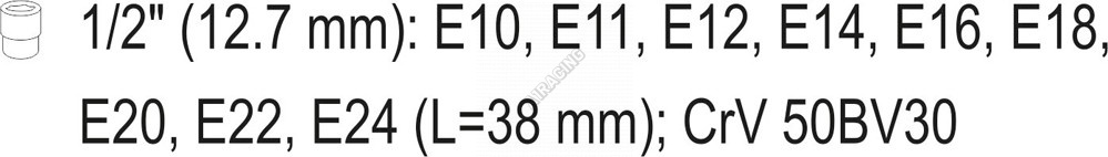 Sada obsahuje 10 ks nástavců se zakončením 1/2" : E10; E11; E12; E14; E116; E18; E20; E22; E24