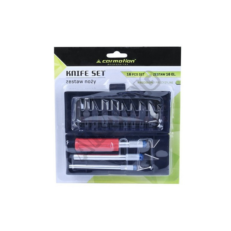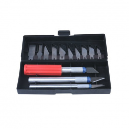 16 nožů pro mnoho aplikací. Ideální pro řezání dřeva, lepenky, papíru, plastu, fólie, vosku a tkanin. Sada obsahuje 3 kovová držadla (1 s plastovou rukojetí) a 13 nožů, vše v plastové krabici pro skladování a manipulaci.