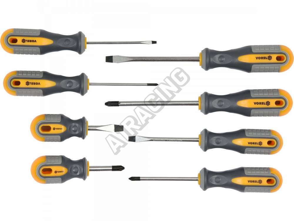 Sada 8ks šroubováků vyrobených z CrV6150 oceli s ergonomicky tvarovanými rukojeťmi z protikluzného PP a TPR.