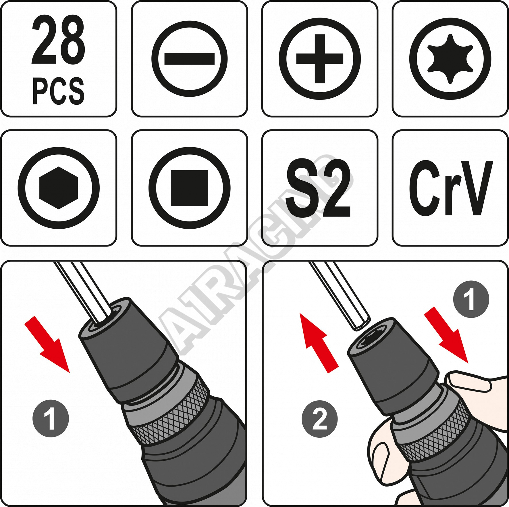 Šroubovák s vyměnitelnými bity YATO YT-24940, sada bitů, přesné bity a nástavce. Speciální převodovk