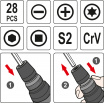 Šroubovák s vyměnitelnými bity YATO YT-24940, sada bitů, přesné bity a nástavce.
