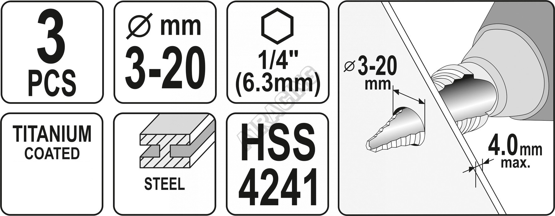 Vrtáky jsou opatřeny několika stupni průměrů, 3 - 12 mm; 4 - 12 mm a 4 - 20 mm které mohou vrtat vždy max. do hloubky 4 mm.