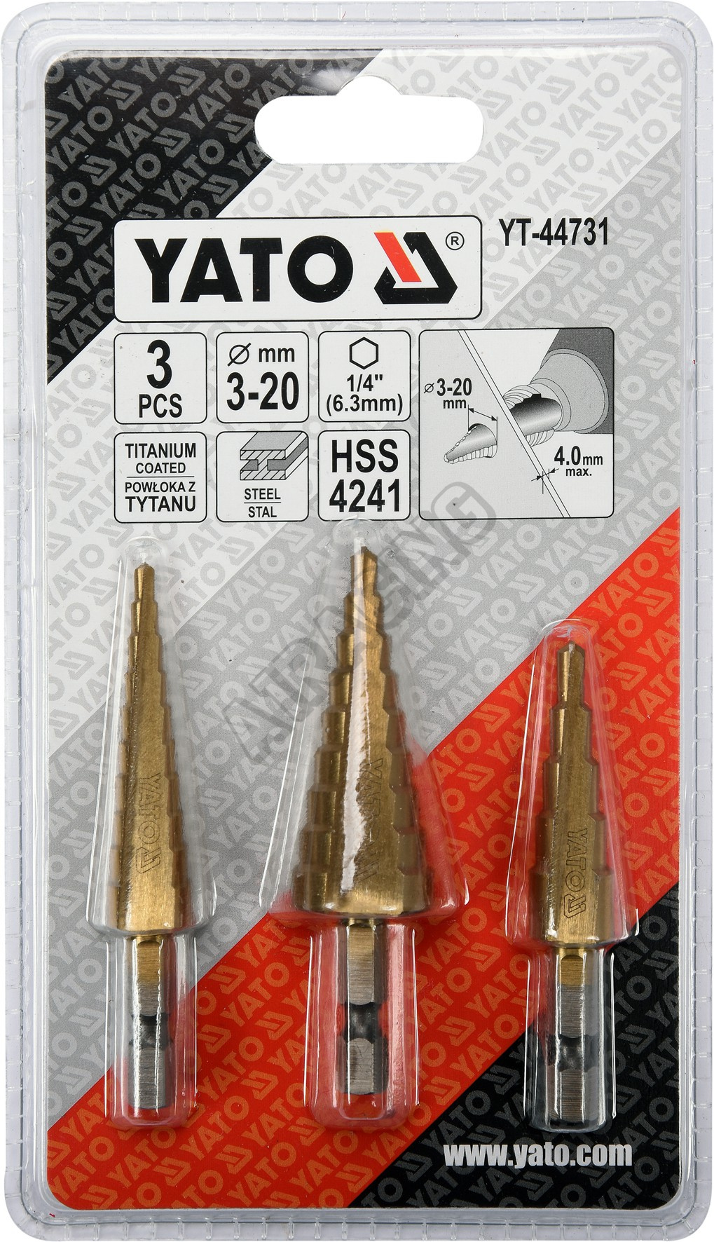 Sada 3 ks stupňovitých kuželových vrtáků na kov umožňující postupné vyvrtání více průměrů otvorů. Vr