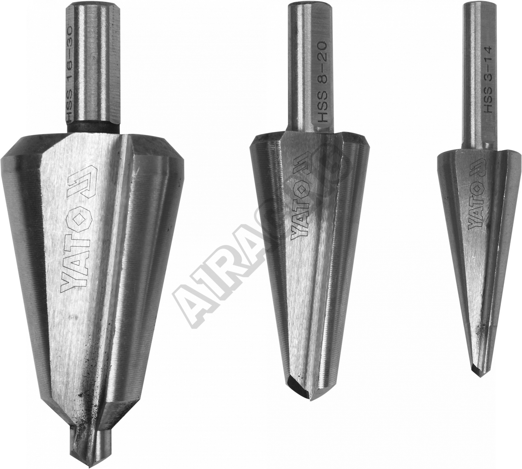 Sada 3 ks stupňovitých kuželových vrtáků na kov umožňující postupné vyvrtání více průměrů otvorů. Vr