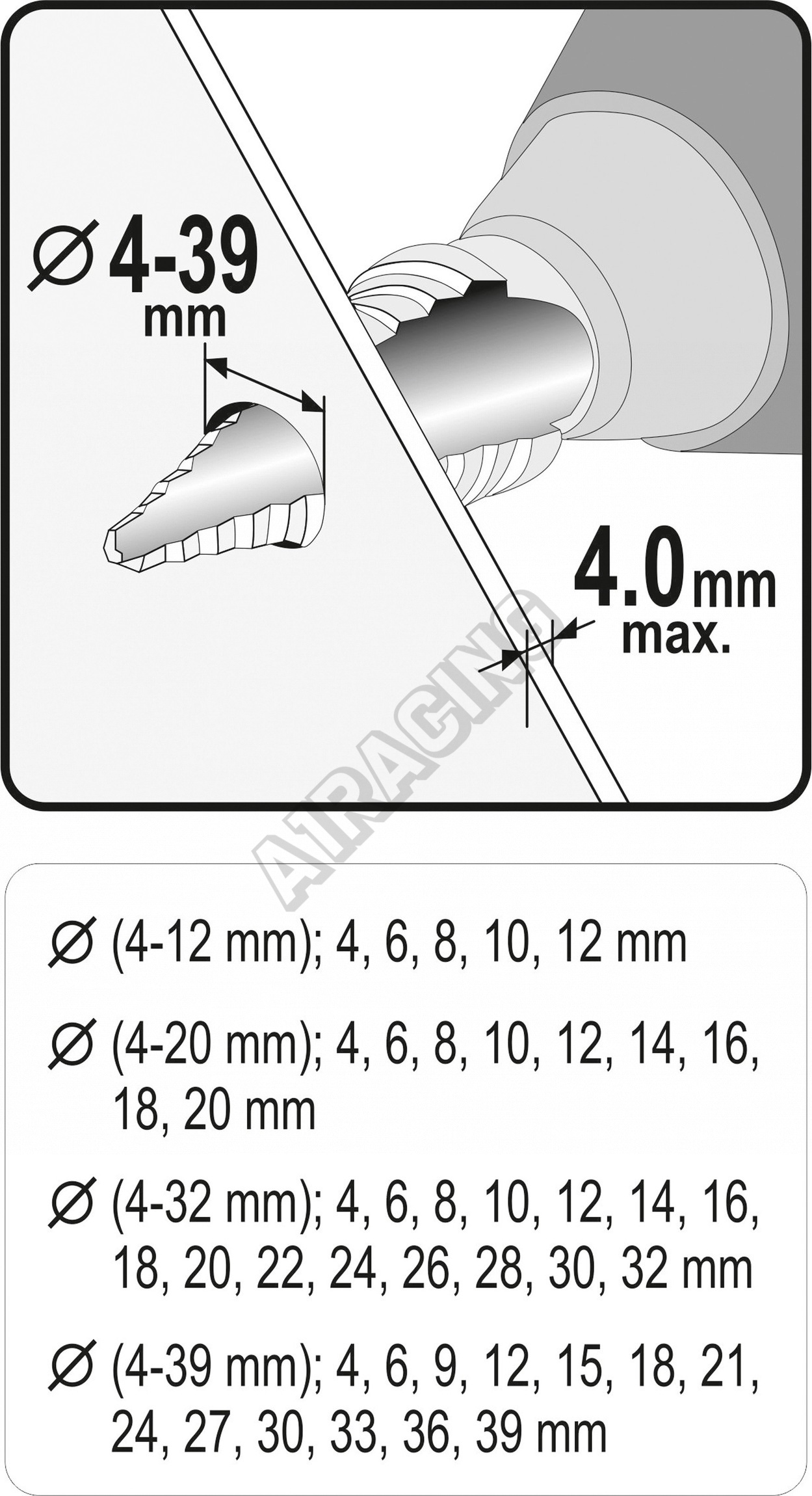 Vrtáky jsou opatřeny několika stupni průměrů, 4 - 12 mm; 4 - 20 mm; 4 - 32 mm a 4 - 39 mm pro vrtání do hloubky max. 4 mm.