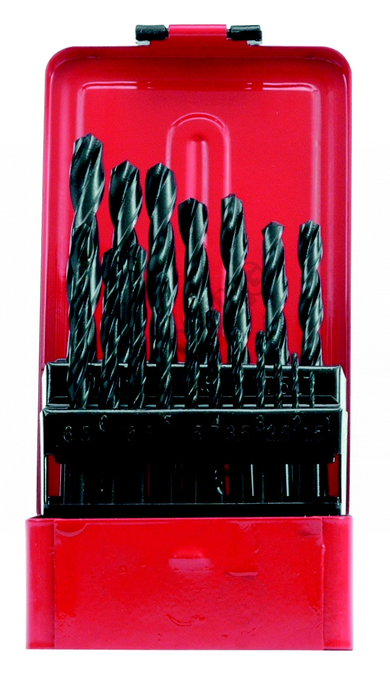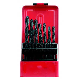 Sada 19 ks vrtáku z rychlořezné oceli s černěným povrchem. Sada je vhodná na kov a je uložena v prak