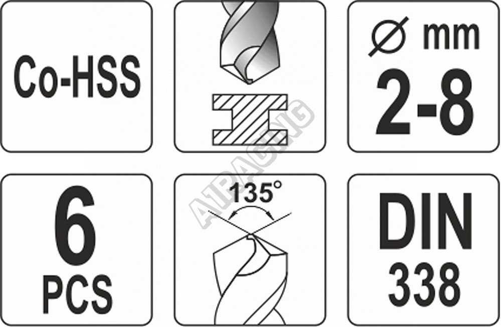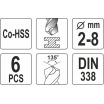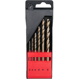Sada spirálových vrtáků z legované rychlořezné oceli podle normy DIN 338. Vrtáky obsahují 5% cobaltu a jsou odolné vůči vysokým teplotám.
