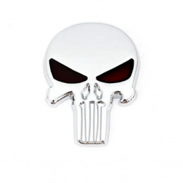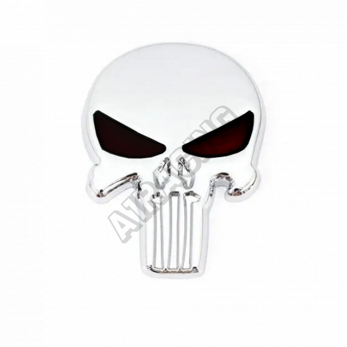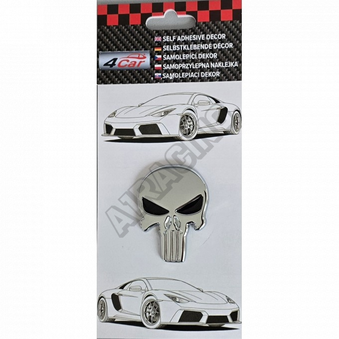Samolepící kovový znak LEBKA (chrom, černé oči ) 75x55 mm Plastová černá část s kovovým logem. Přip