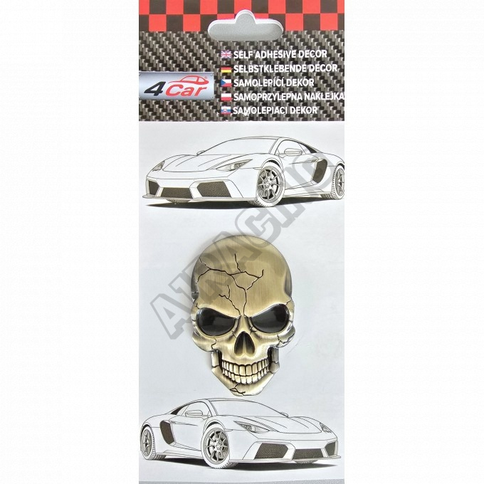 Samolepící kovový znak LEBKA (gold) 43x68 mm Plastová černá část s kovovým logem. Připevnění pomocí