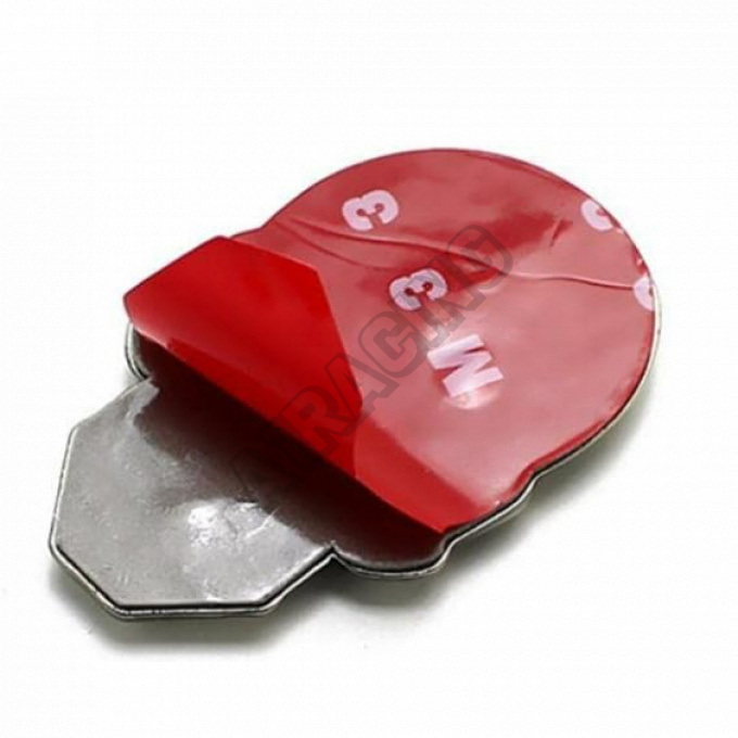 Plastová černá část s kovovým logem. Připevnění pomocí oboustranné lepící pásky, která je součástí balení.