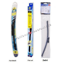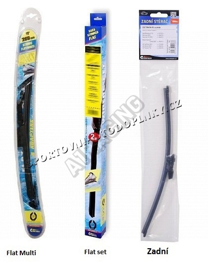 Stěrače FLAT SET (sada 2 ks na celé auto). Vysoce kvalitní pružný člen plochého stěrače zajišťuje stejnoměrný tlak grafitového břitu v celé jeho délce, což zamezuje rozmazávání nečistot a vytváření pruhů.
