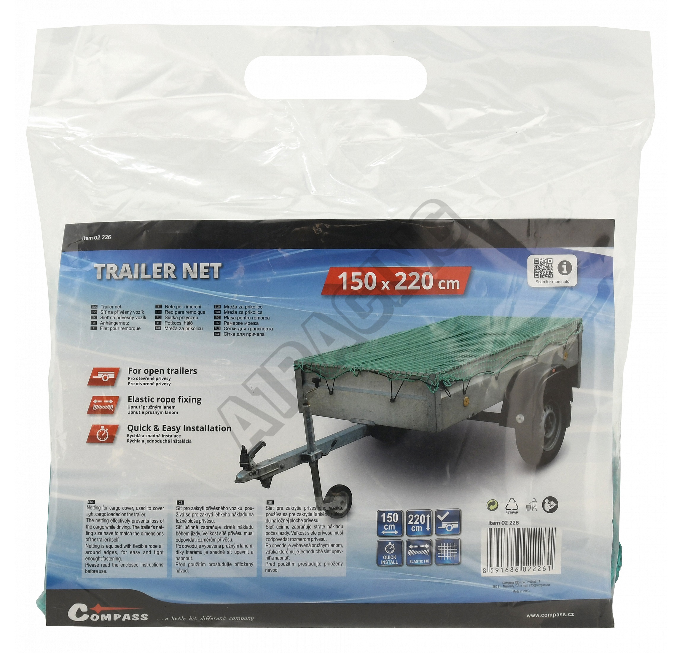 Velikost sítě musí odpovídat rozměrům přívěsu, tato síť má rozměry 150 x 220 cm s oky čtvercového tvaru s rozměry 4 x 4 cm.