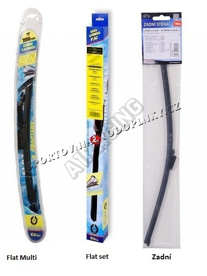 Stěrače FLAT SET (sada 2 ks na celé auto). Vysoce kvalitní pružný člen plochého stěrače zajišťuje stejnoměrný tlak grafitového břitu v celé jeho délce, což zamezuje rozmazávání nečistot a vytváření pruhů.